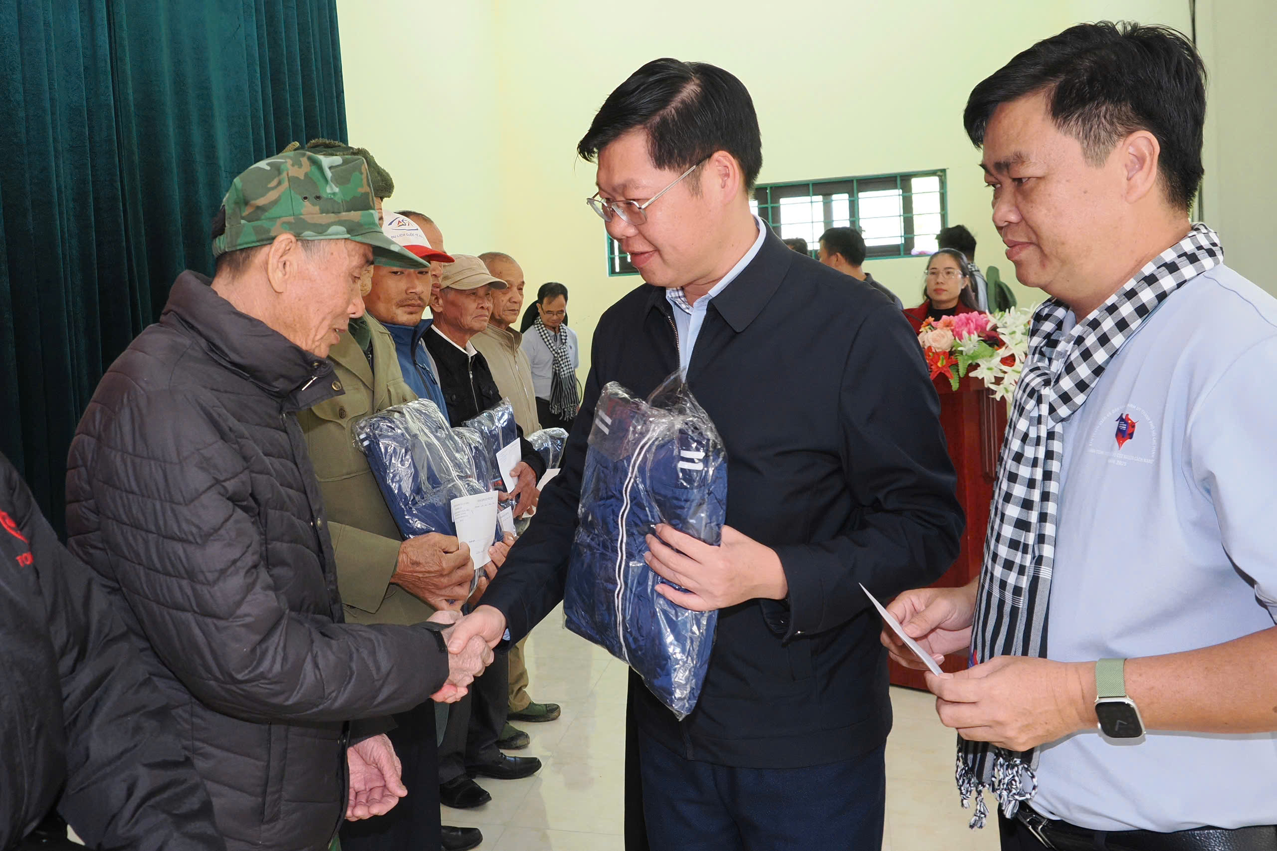 Đoàn công tác TPHCM trao tặng 500 lá cờ Tổ quốc, tặng 100 áo ấm, 1 tủ sách Bác Hồ. Ảnh: HOÀNG HÙNG