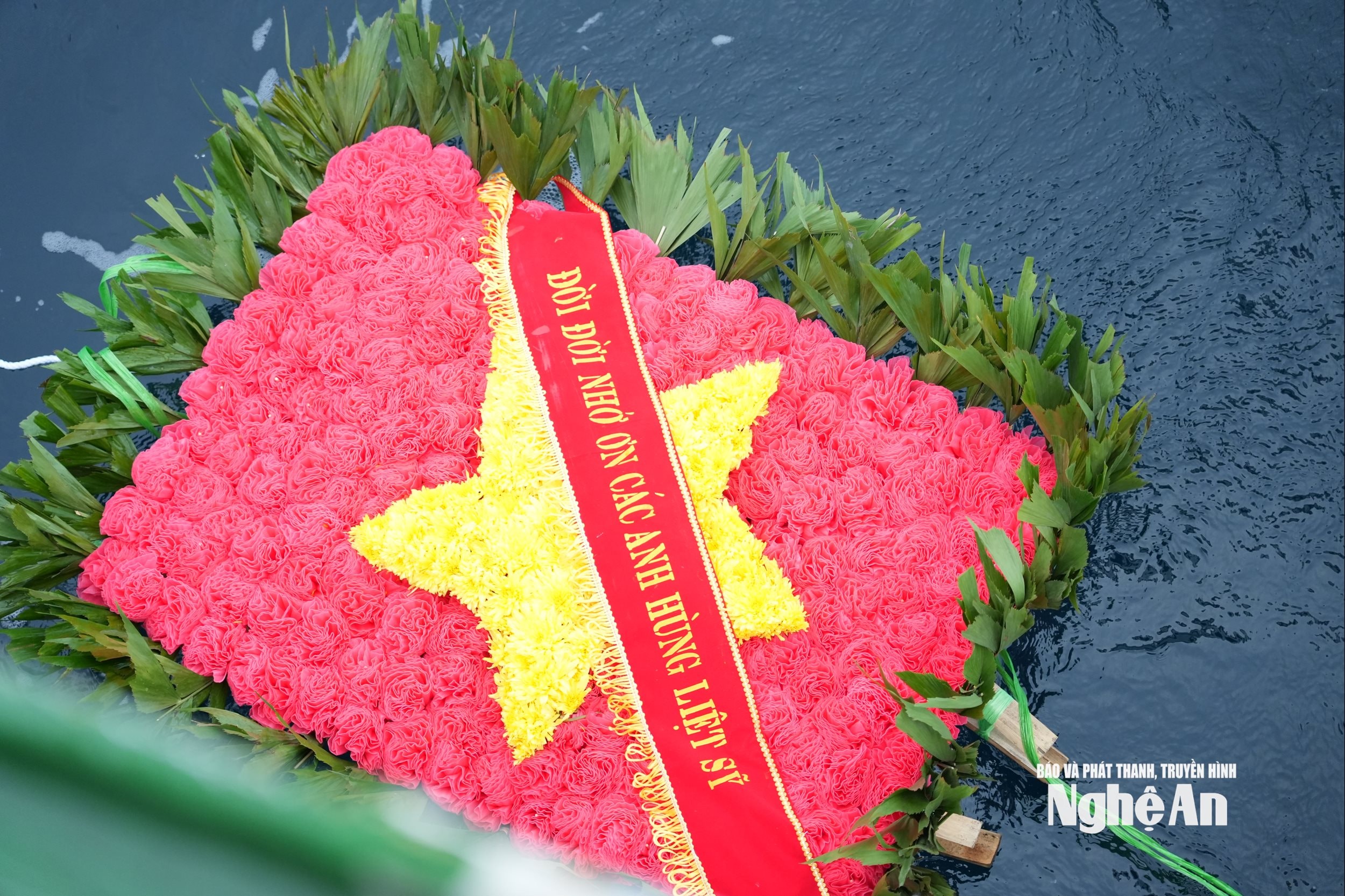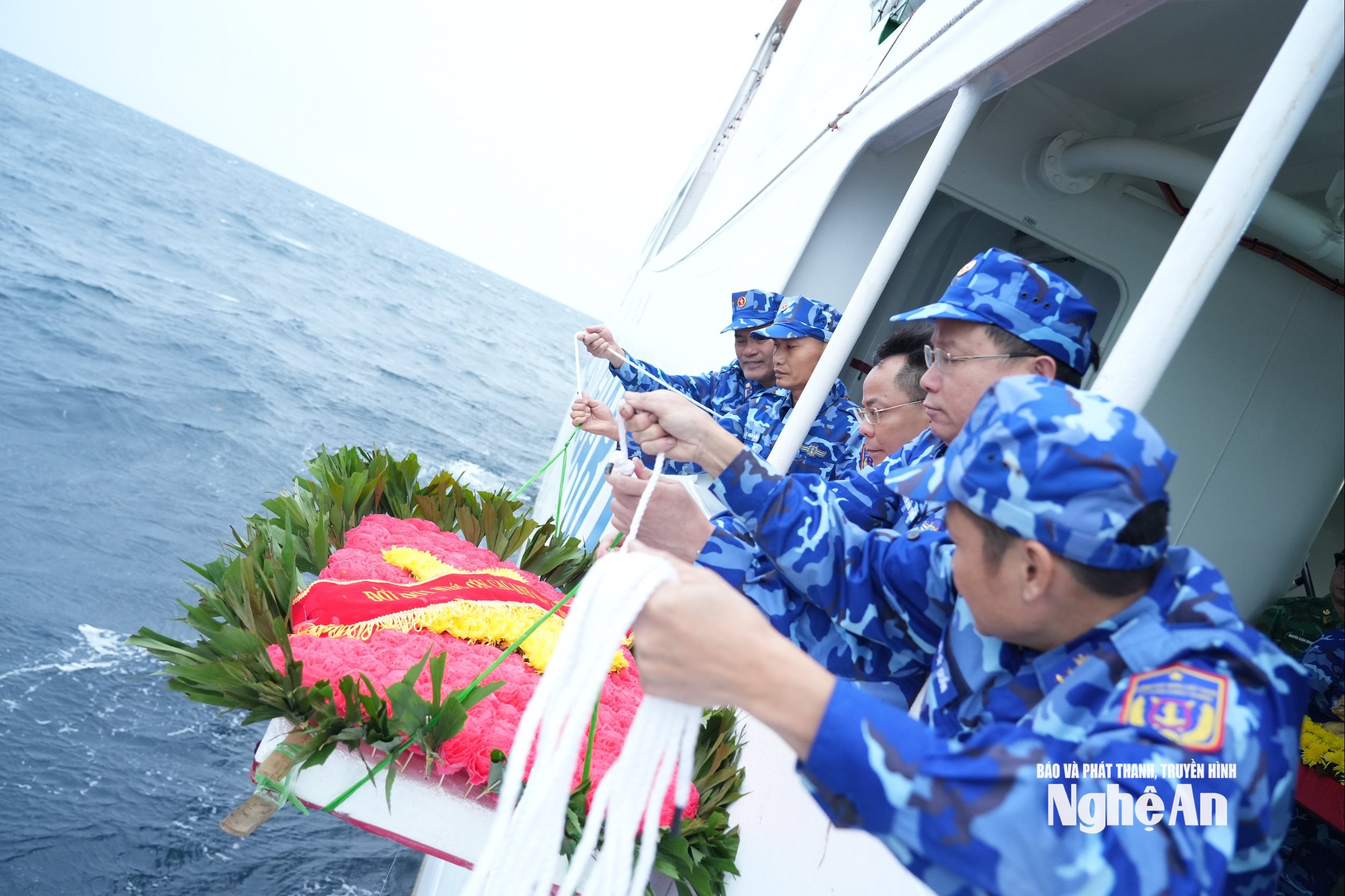 Vòng hoa tưởng niệm được thả xuống biển. Ảnh: Đào Tuấn