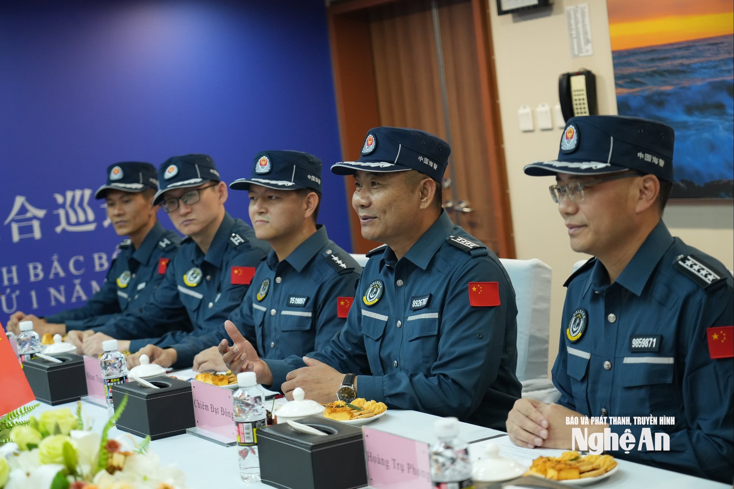 Đại tá Chiêm Đạt Đông - Phân cục phó Phân cục Hải Nam, Cảnh sát biển Trung Quốc cùng các thành viên dự buổi hội đàm. Ảnh: Đào Tuấn