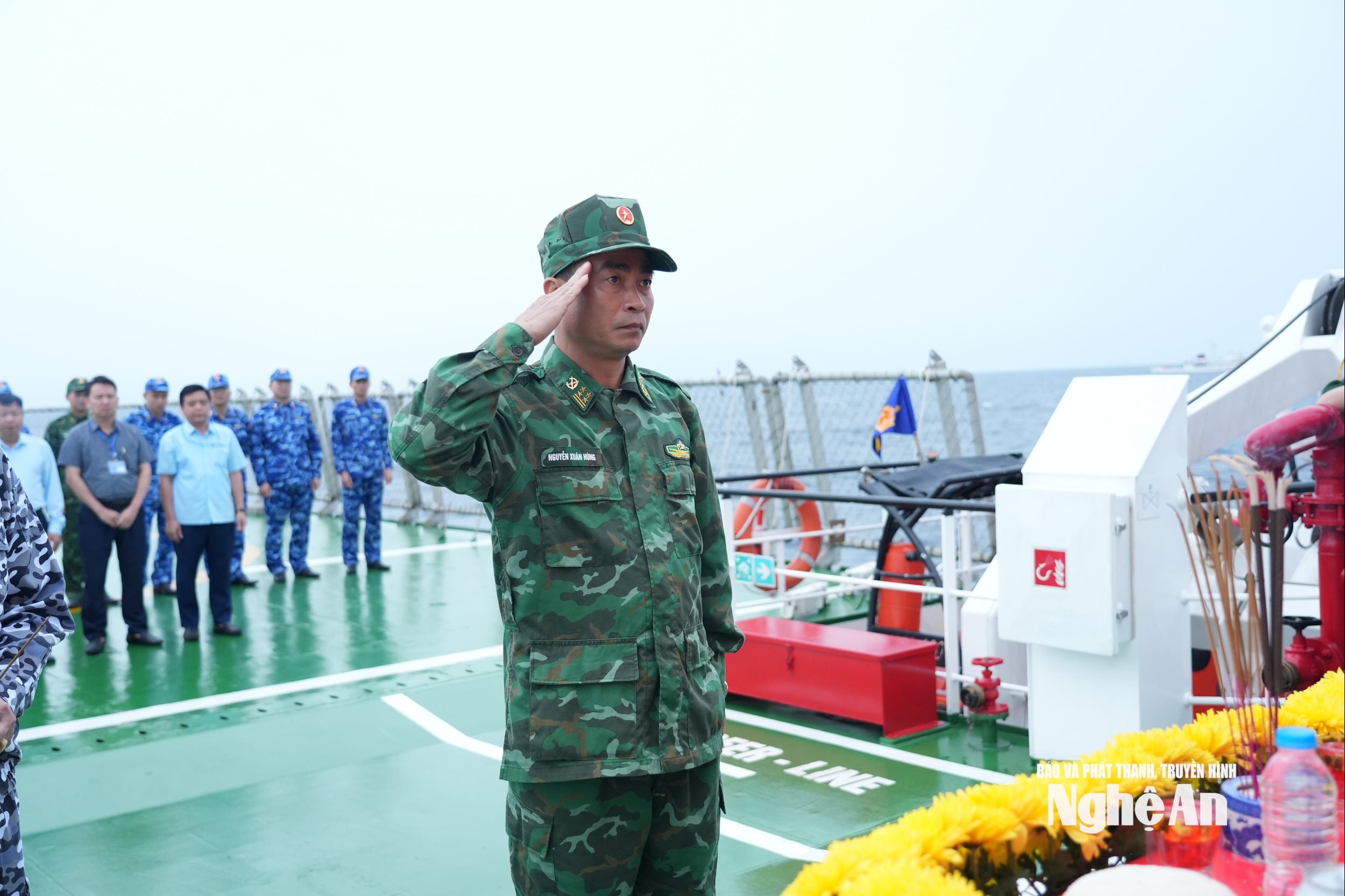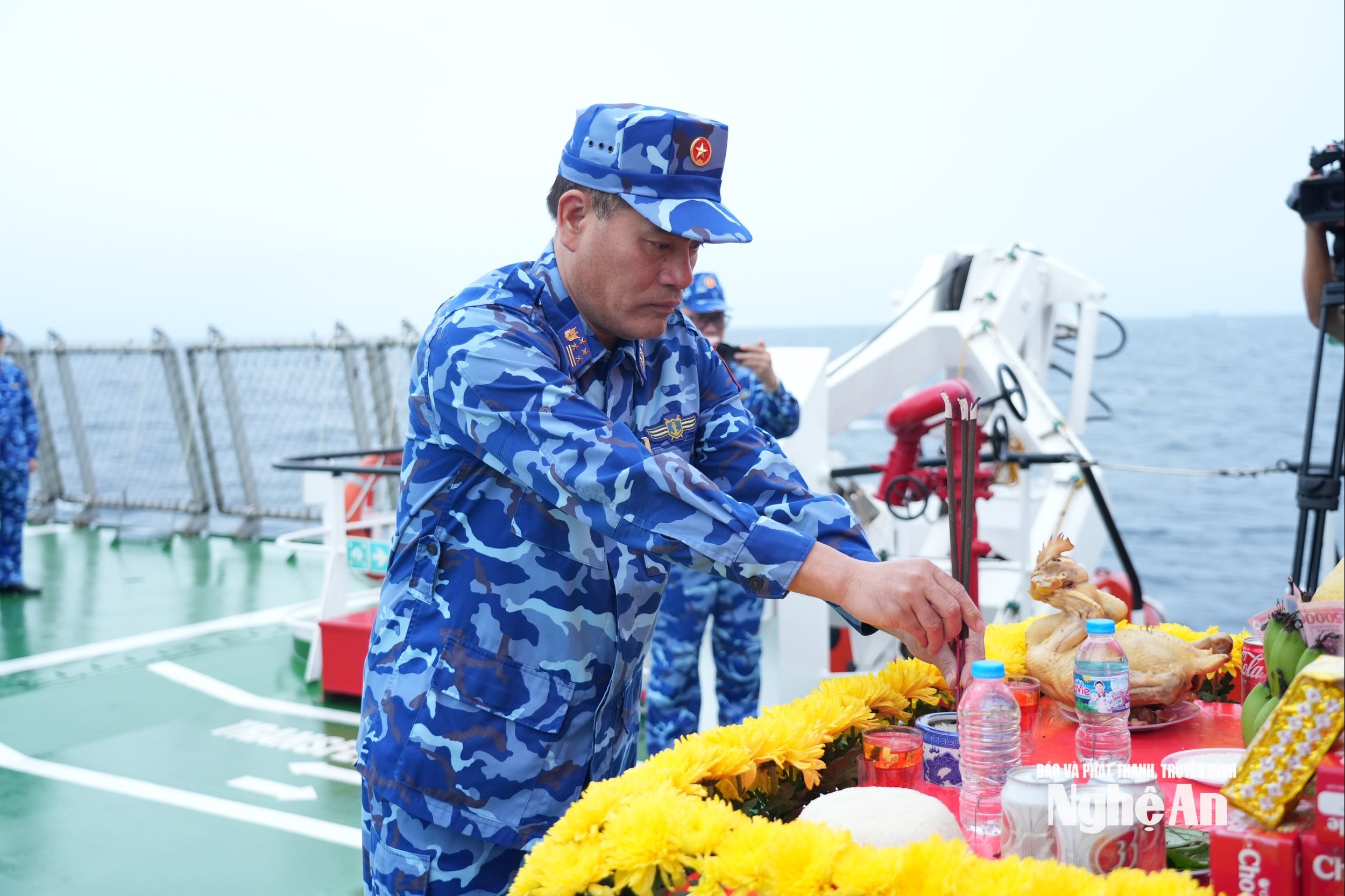 Trong giờ phút thiêng liêng trên vùng biển trời của Tổ quốc, đồng chí Đại tá Lương Cao Khải - Phó Tư lệnh, Tham mưu trưởng Bộ Tư lệnh Vùng Cảnh sát biển 1 và các thành viên đoàn công tác dâng hương tưởng niệm các Anh hùng liệt sĩ đã hy sinh và bà con ngư dân nằm lại trên biển để bảo vệ vùng phên dậu của đất nước.