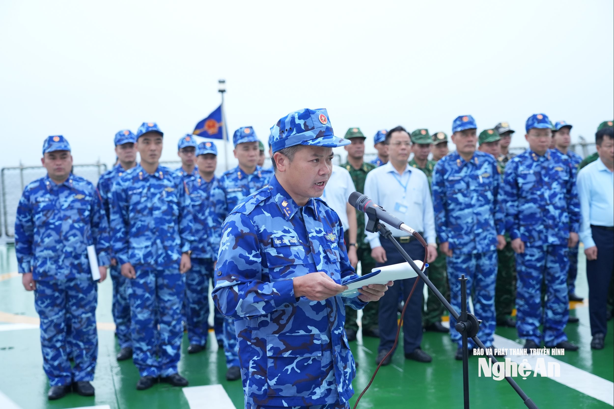 Trung tá Tống Duy Thuần - Phó Chính ủy Hải đoàn 11, Vùng Cảnh sát biển 1 đọc lời tưởng niệm. Ảnh: Sơn Hiếu
