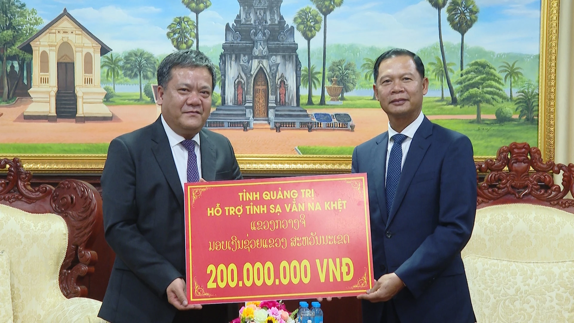 Đoàn đại biểu cấp cao tỉnh Quảng Trị trao hỗ trợ tỉnh Savannakhet 200 triệu đồng thực hiện công tác an sinh xã hội - Ảnh: Đ.A