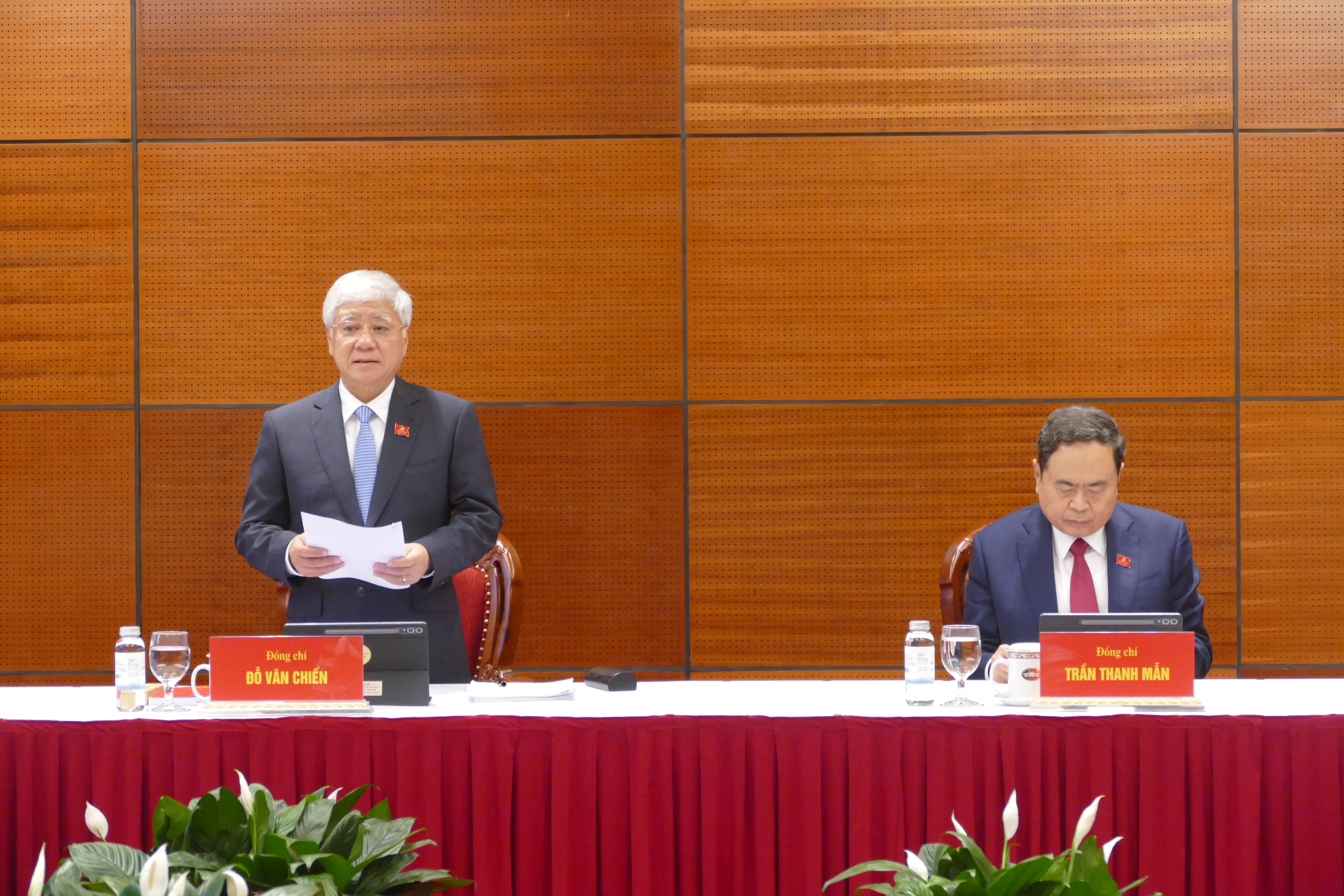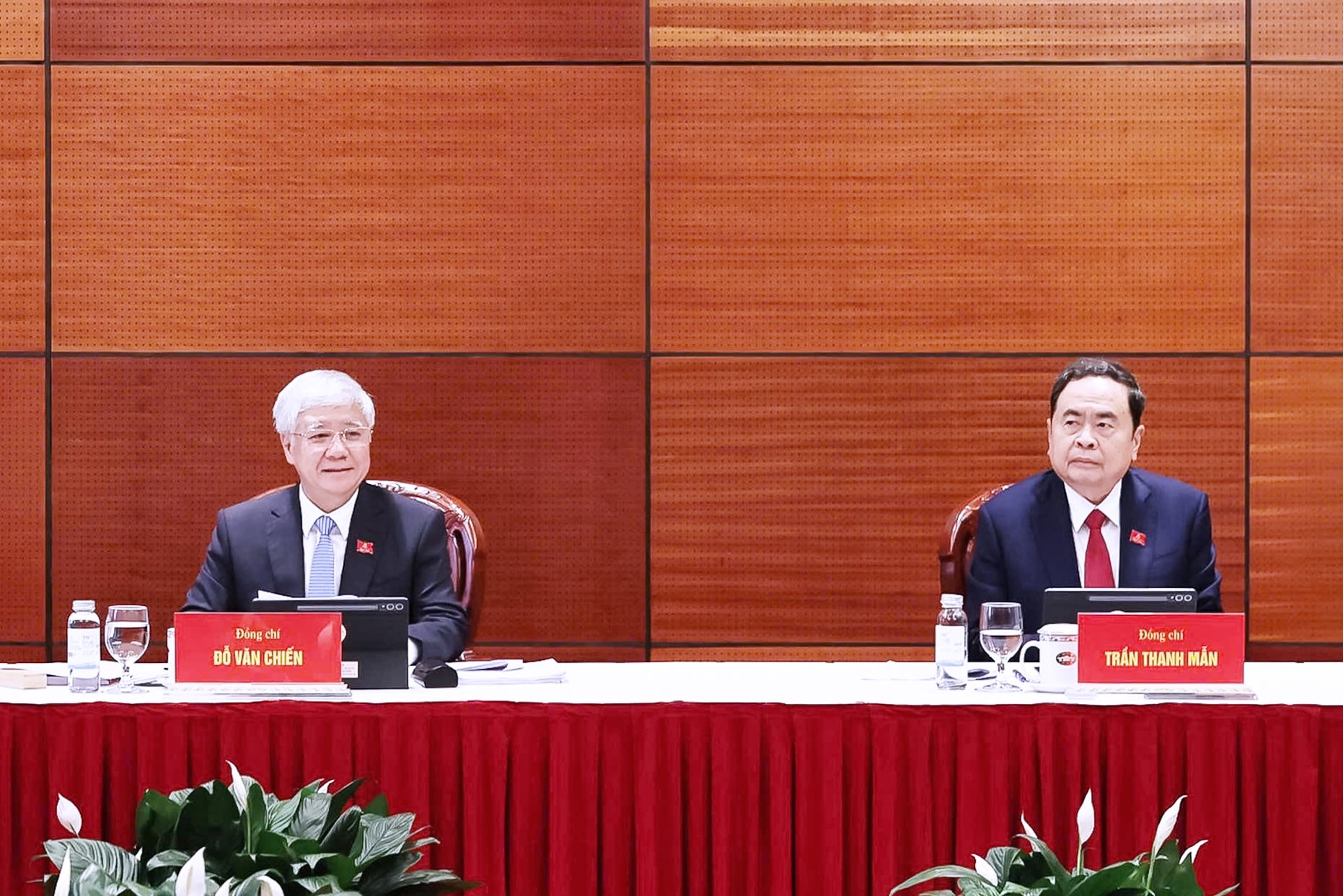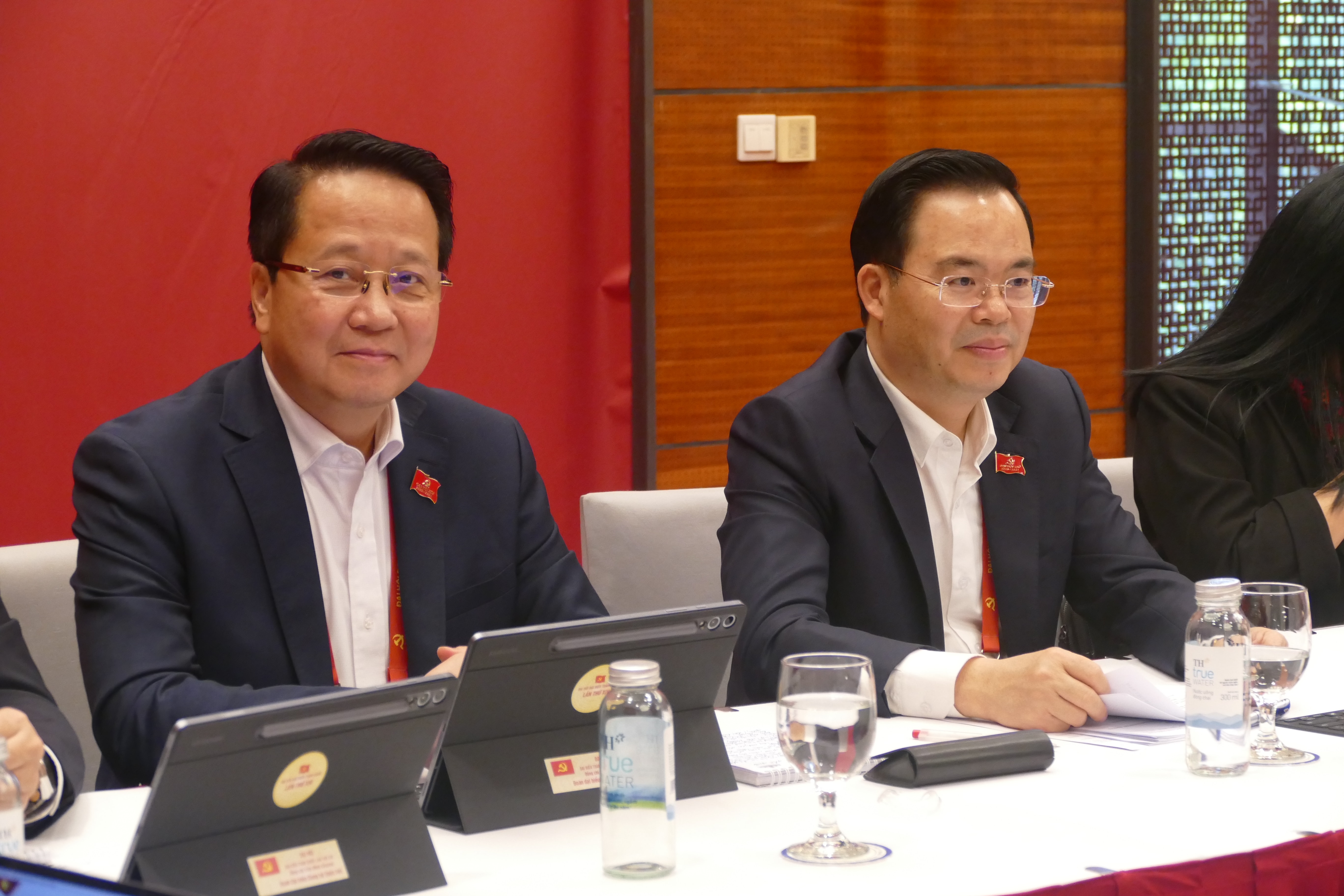 Ủy viên Bộ Chính trị, Bí thư Đảng ủy Quốc hội, Chủ tịch Quốc hội Trần Thanh Mẫn; Ủy viên Bộ Chính trị, Phó Bí thư Thường trực Đảng ủy Quốc hội, Phó Chủ tịch Thường trực Quốc hội Đỗ Văn Chiến - Trưởng đoàn đại biểu Đảng bộ Quốc hội tham dự thảo luận tại Đoàn về các dự thảo văn kiện trình Đại hội XIV . Ảnh: Nhật Bắc. Ảnh: Nhật Bắc