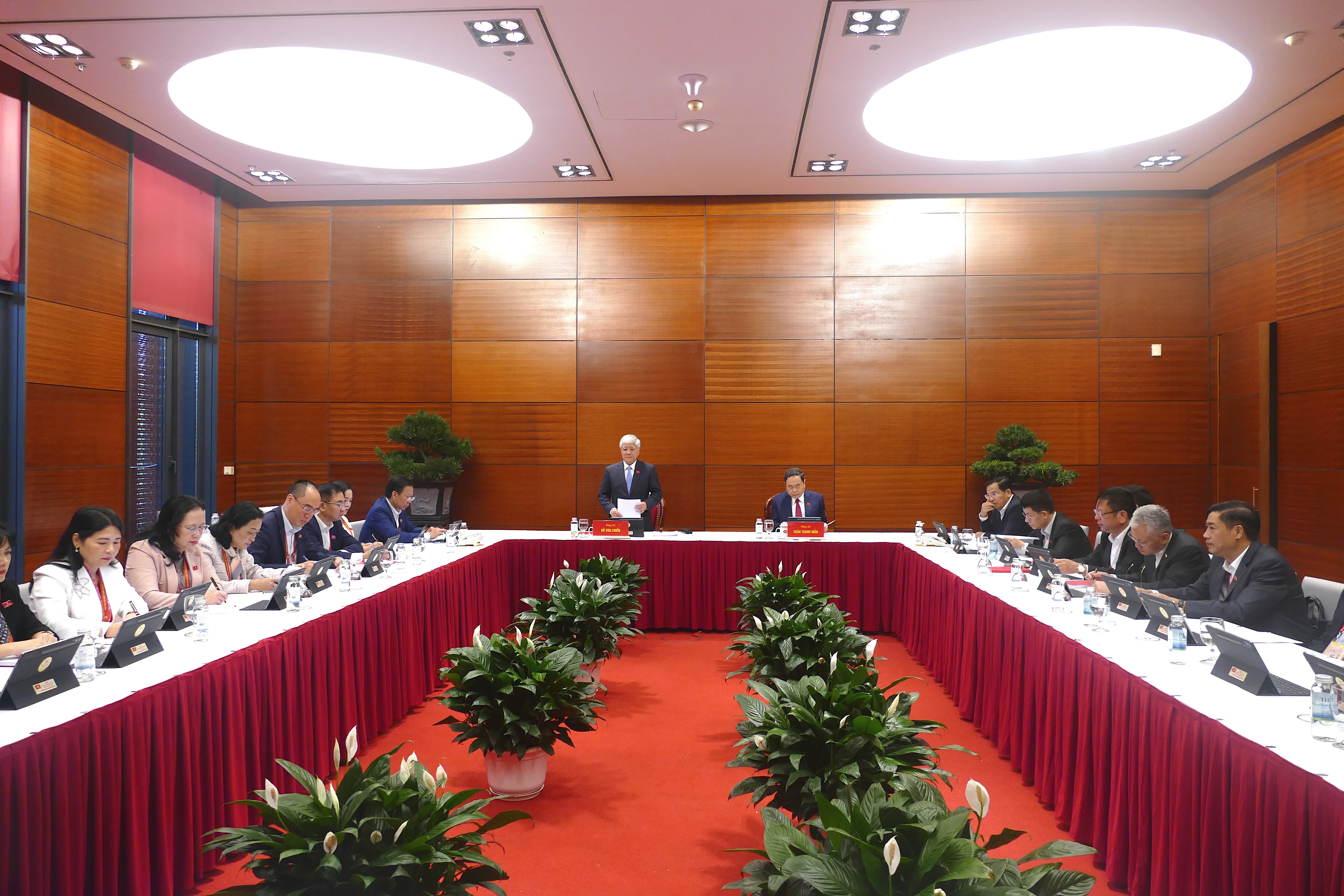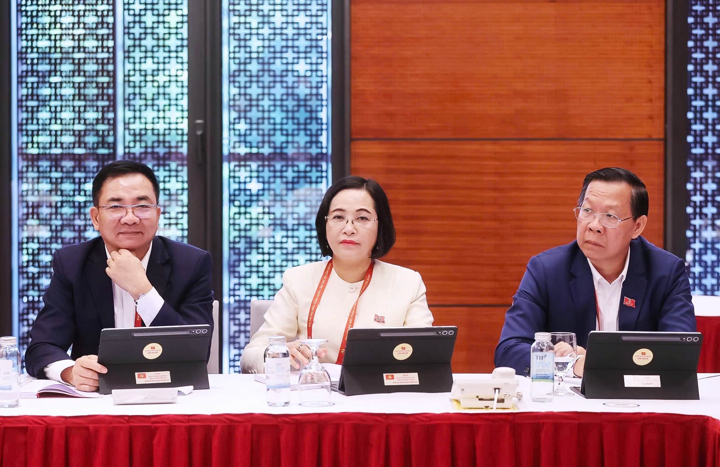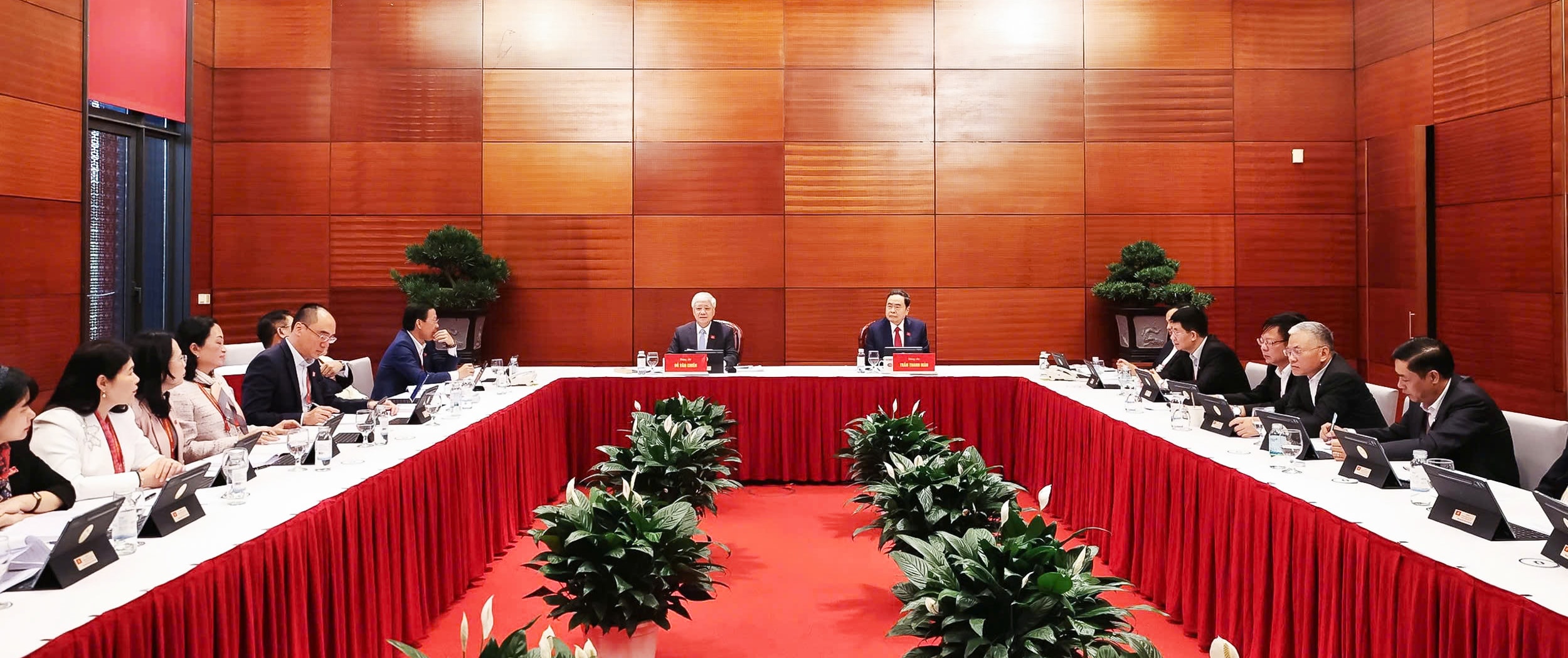 Ủy viên Bộ Chính trị, Bí thư Đảng ủy Quốc hội, Chủ tịch Quốc hội Trần Thanh Mẫn; Ủy viên Bộ Chính trị, Phó Bí thư Thường trực Đảng ủy Quốc hội, Phó Chủ tịch Thường trực Quốc hội Đỗ Văn Chiến - Trưởng đoàn đại biểu Đảng bộ Quốc hội tham dự thảo luận tại Đoàn về các dự thảo văn kiện trình Đại hội XIV . Ảnh: Nhật Bắc. Ảnh: Nhật Bắc