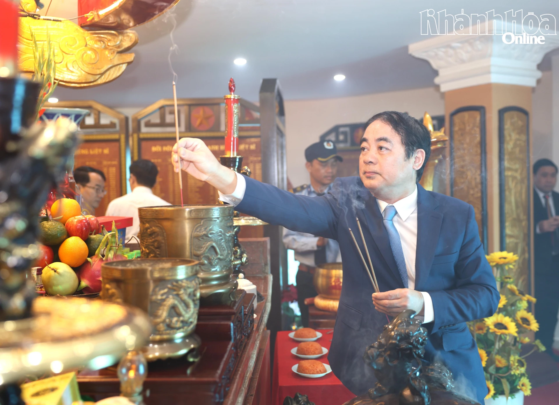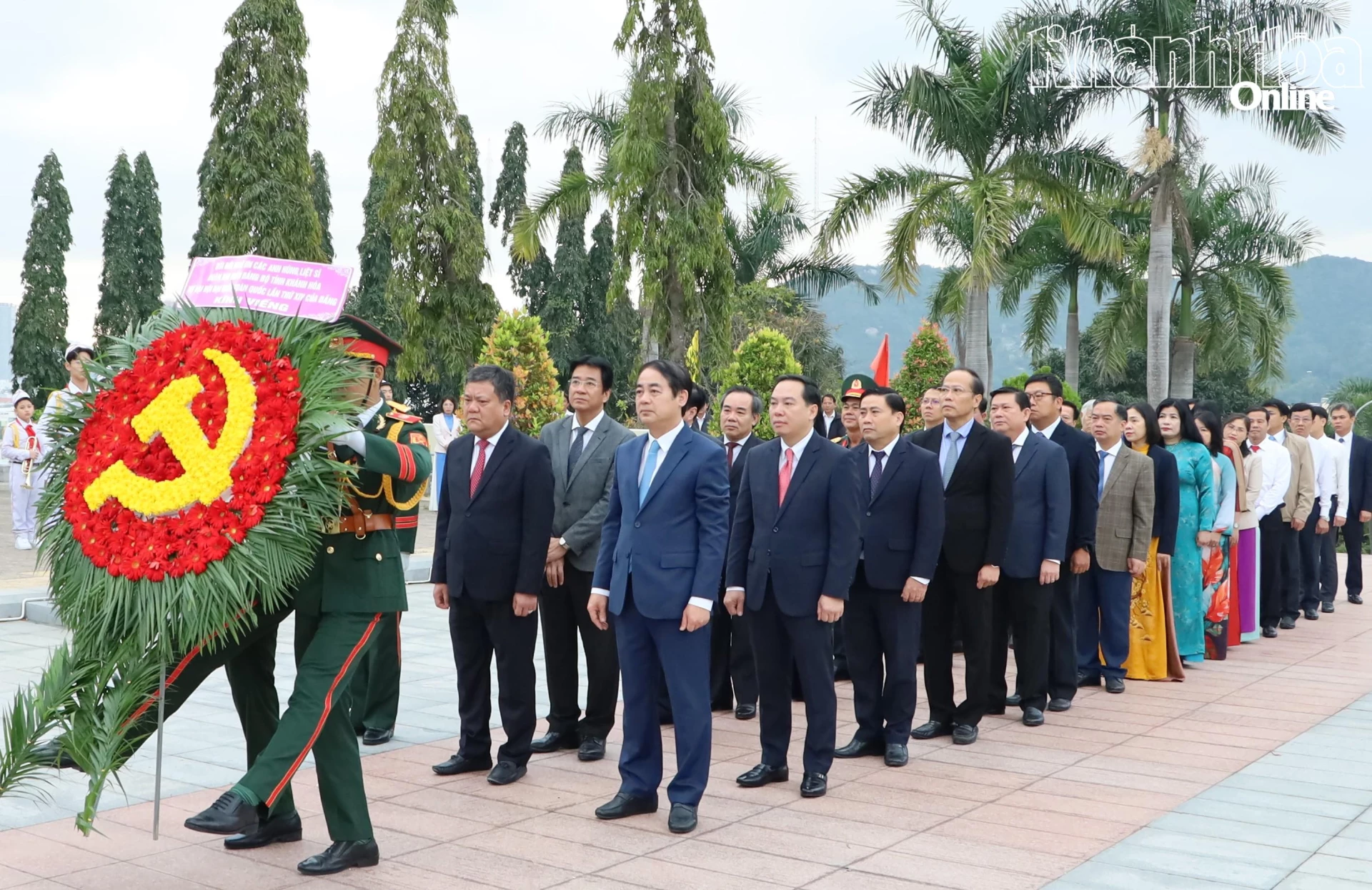 Trong không khí trang nghiêm, với tấm lòng thành kính và tri ân sâu sắc, các đồng chí: Nghiêm Xuân Thành, Hồ Xuân Trường, Lâm Đông, Trần Phong, Nguyễn Khắc Hà và các đại biểu đã dâng hương tại Đền thờ Bác Hồ và các anh hùng, liệt sĩ trong khuôn viên Nghĩa trang liệt sĩ Hòn Dung. Tiếp đó, các đồng chí lãnh đạo tỉnh và các đại biểu đã trang trọng dâng vòng hoa mang dòng chữ “Đời đời nhớ ơn các anh hùng, liệt sĩ” tại Đài tưởng niệm Nghĩa trang liệt sĩ Hòn Dung.