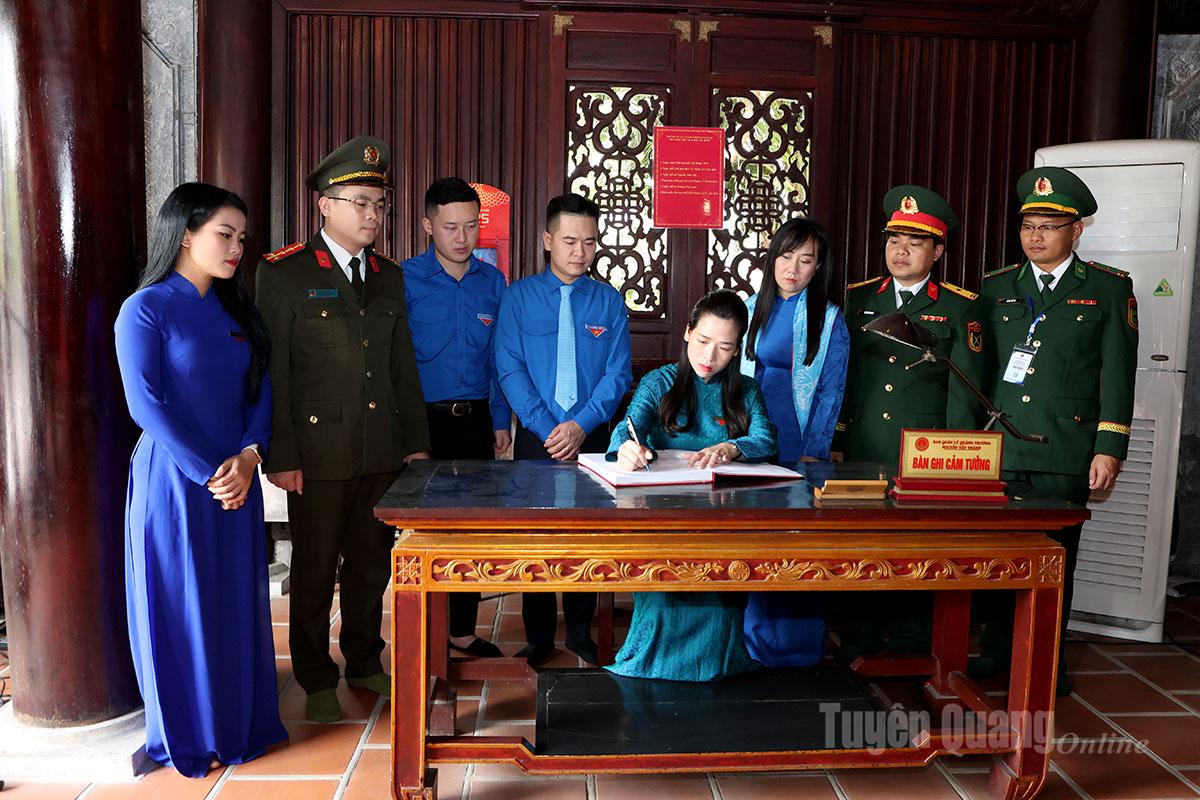 Đồng chí Dương Minh Nguyệt, Ủy viên BCH Đảng bộ tỉnh, Phó Chủ tịch Ủy ban MTTQ Việt Nam tỉnh, Bí thư Tỉnh đoàn, Chủ tịch Hội LHTN Việt Nam tỉnh ghi lưu bút vào Sổ truyền thống tại Đền thờ Chủ tịch Hồ Chí Minh.