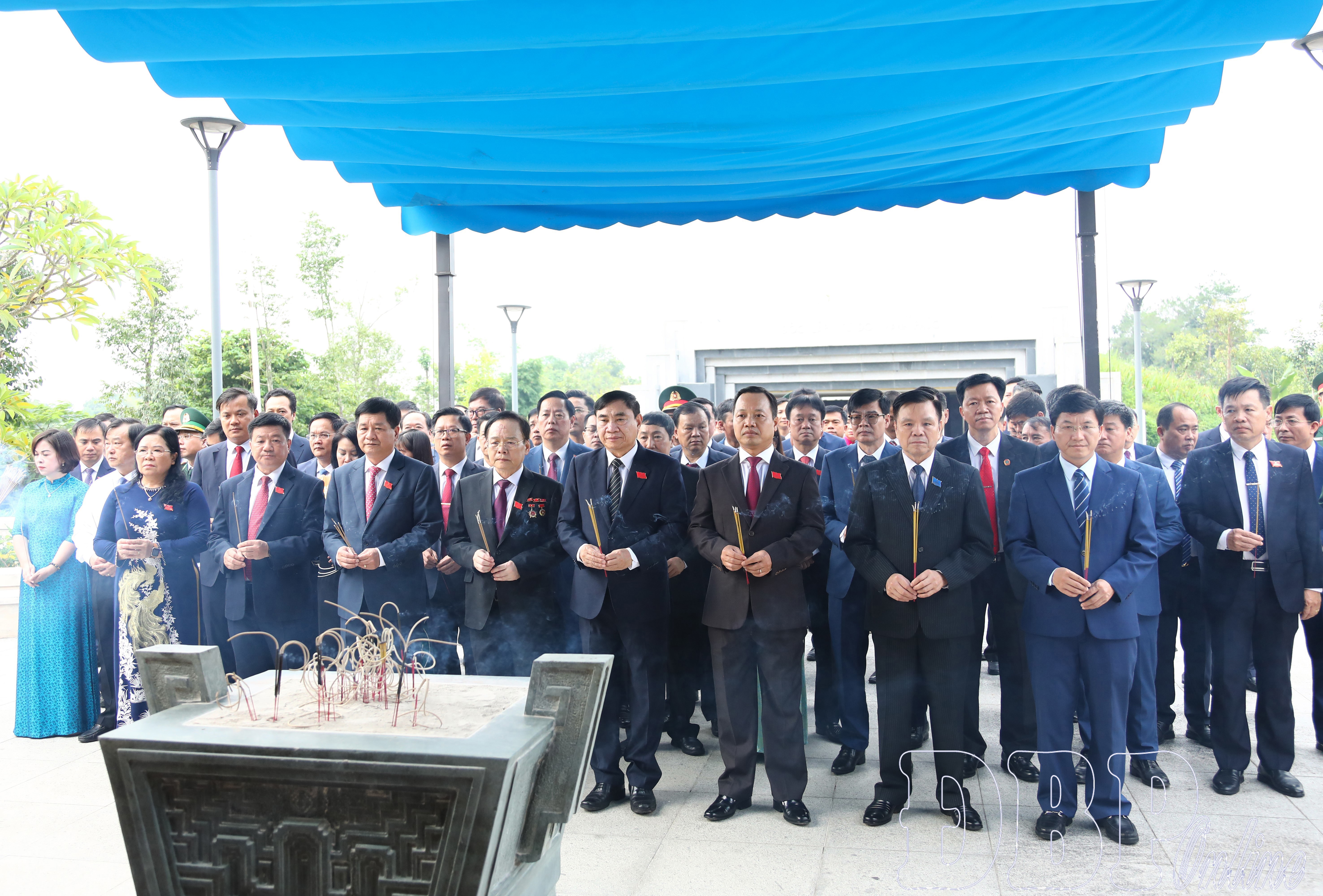 Trong không khí trang nghiêm, đoàn đại biểu đặt vòng hoa, dâng hương tưởng nhớ và bày tỏ lòng biết ơn sâu sắc các anh hùng, liệt sĩ, chiến sĩ lực lượng vũ trang, thanh niên xung phong, dân công hỏa tuyến và đồng bào đã anh dũng chiến đấu, phục vụ chiến đấu, hy sinh vì độc lập dân tộc, tự do cho nhân dân.