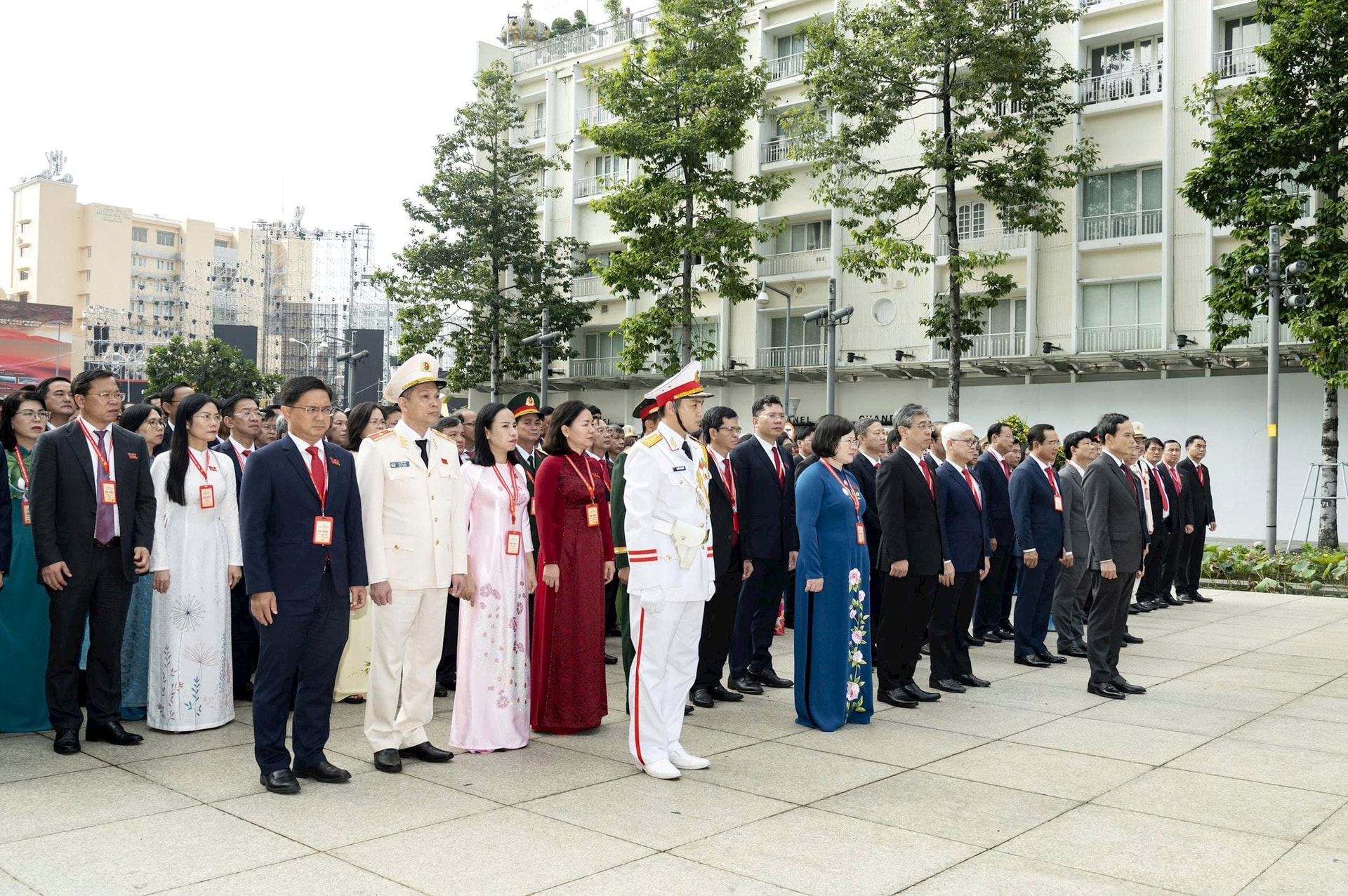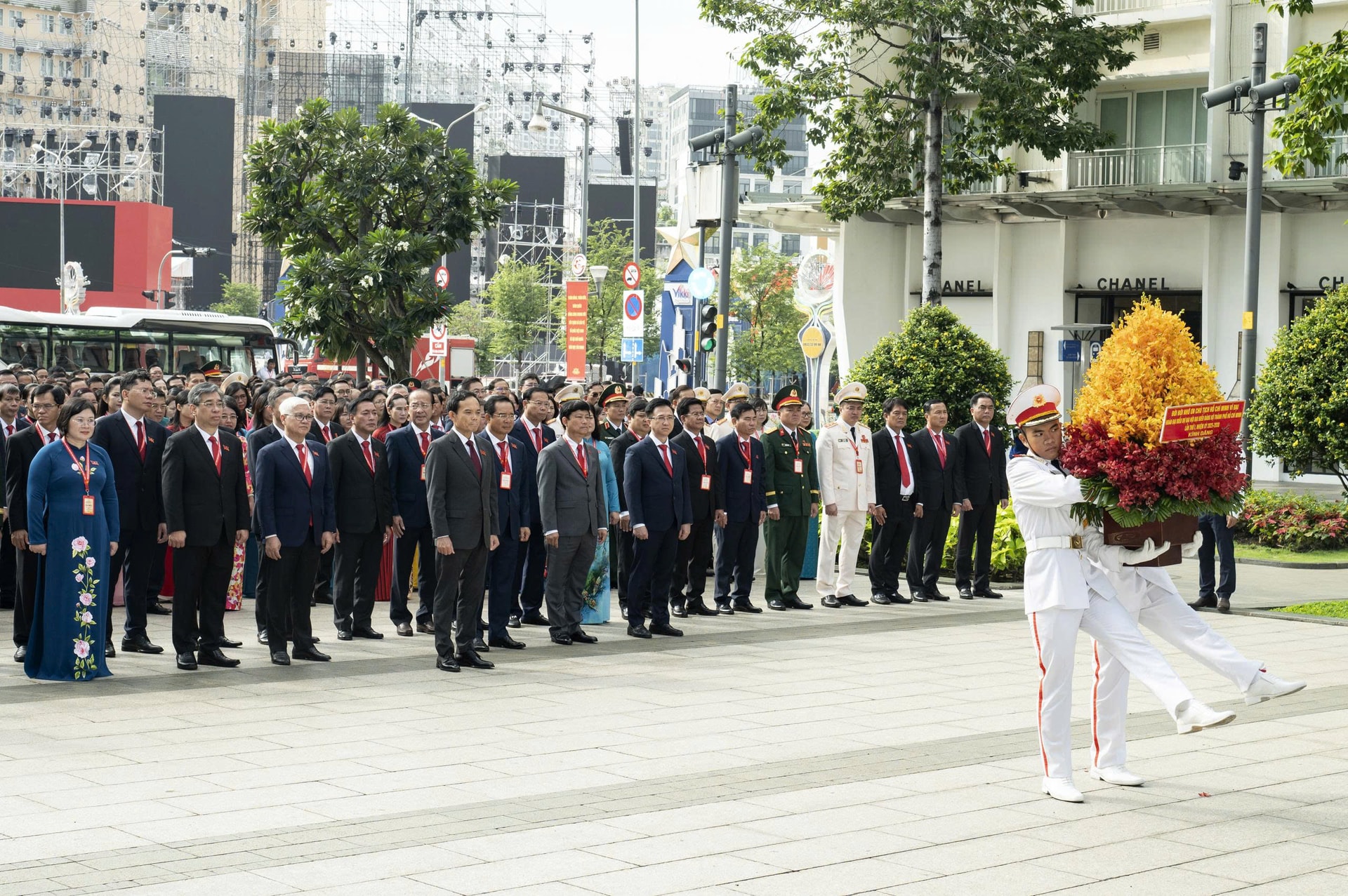 Tiếp đó, đoàn đến dâng hoa và dành phút mặc niệm tưởng nhớ công lao của Chủ tịch Hồ Chí Minh tại Công viên tượng đài Chủ tịch Hồ Chí Minh (đường Nguyễn Huệ, phường Sài Gòn, TP.HCM).