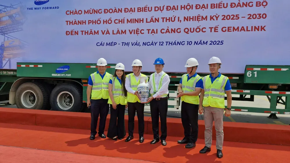 Sau Bộ tư lệnh Vùng 2 Hải quân, Đoàn đại biểu dự Đại hội Đảng bộ TP.HCM lần thứ I, nhiệm kỳ 2025-2030 đã đến thăm cảng Quốc tế Gemalink tại khu vực Cái Mép (phường Tân Phước, TP.HCM).