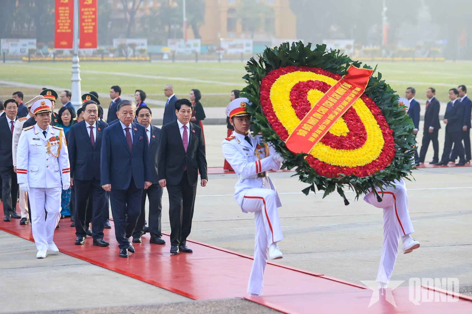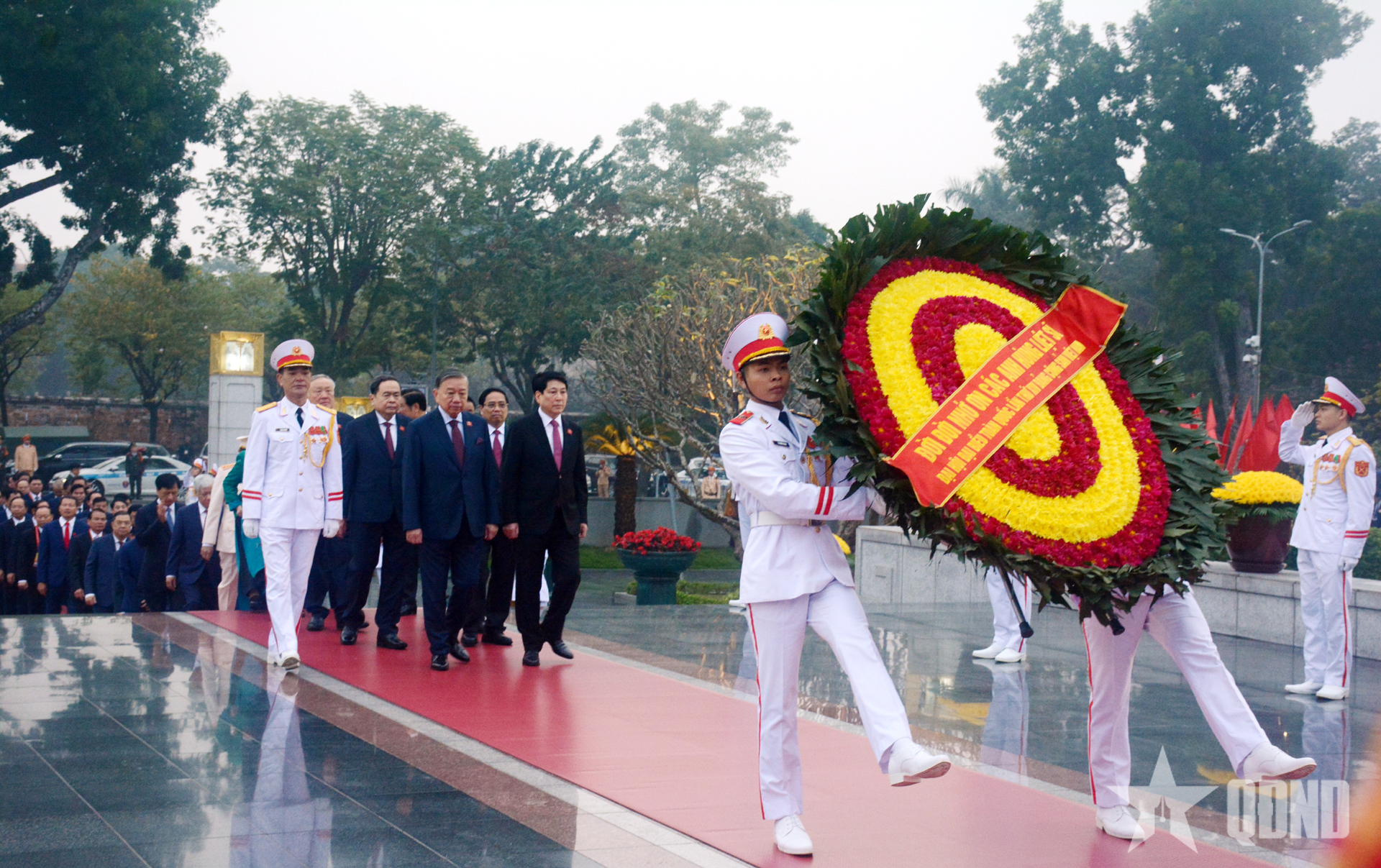 Tổng Bí thư Tô Lâm cùng các đồng chí lãnh đạo Đảng, Nhà nước dâng hoa tưởng niệm Chủ tịch Hồ Chí Minh. Ảnh: TRỌNG HẢI