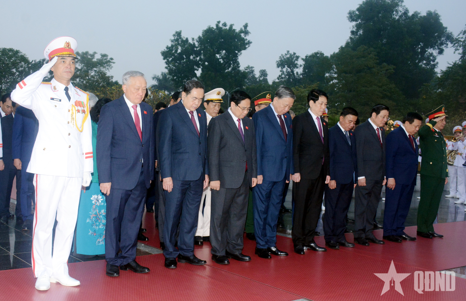 Tổng Bí thư Tô Lâm cùng các đồng chí lãnh đạo Đảng, Nhà nước tưởng niệm Chủ tịch Hồ Chí Minh. Ảnh: TRỌNG HẢI