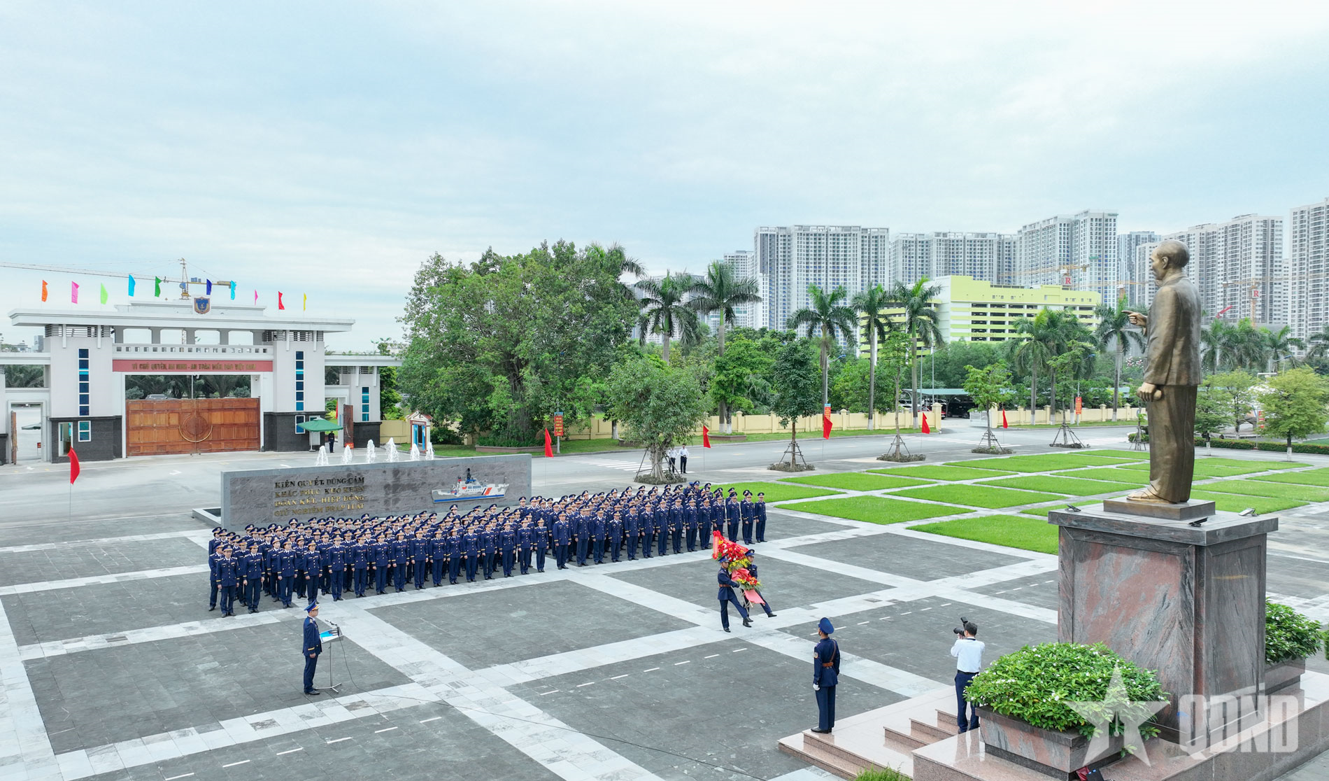 Trước Tượng đài Chủ tịch Hồ Chí Minh trong khuôn viên trụ sở Cơ quan Bộ tư lệnh Cảnh sát biển, đoàn đại biểu đã thành kính dâng lẵng hoa tươi thắm, báo công dâng Bác và bày tỏ lòng biết ơn sâu sắc đối với công lao to lớn của Người - vị lãnh tụ thiên tài của Đảng và cách mạng Việt Nam, người cha thân yêu của các lực lượng vũ trang nhân dân, Người đã trọn đời phấn đấu hy sinh vì độc lập, tự do của Tổ quốc và hạnh phúc của nhân dân.