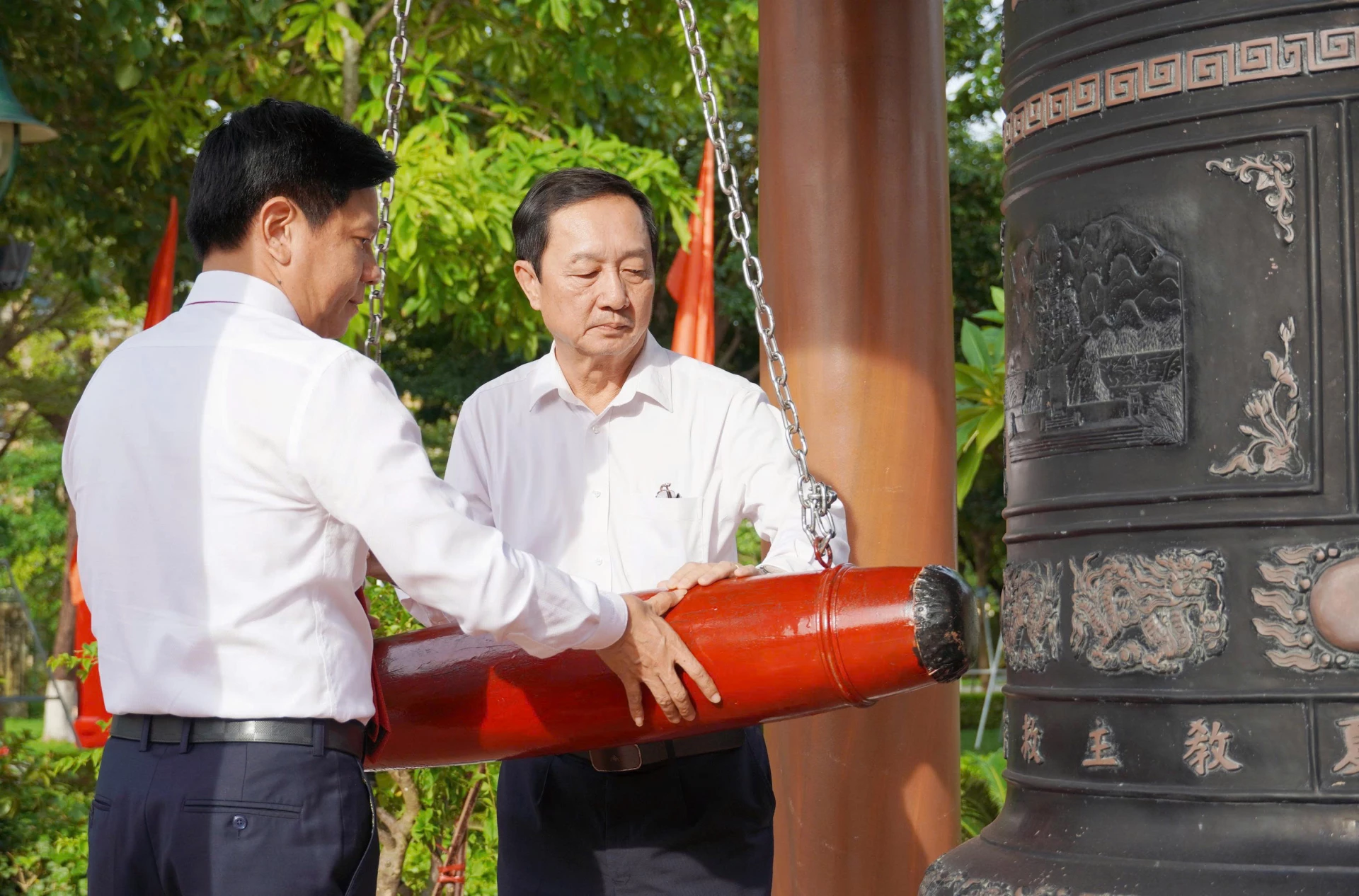 Đồng chí Phó trưởng Ban Tuyên giáo và Dân vận Trung ương Huỳnh Thành Đạt và đồng chí Phó Chủ tịch HĐND tỉnh Lê Vĩnh Thế thực hiện nghi thức thỉnh chuông - Ảnh: Xuân Phú