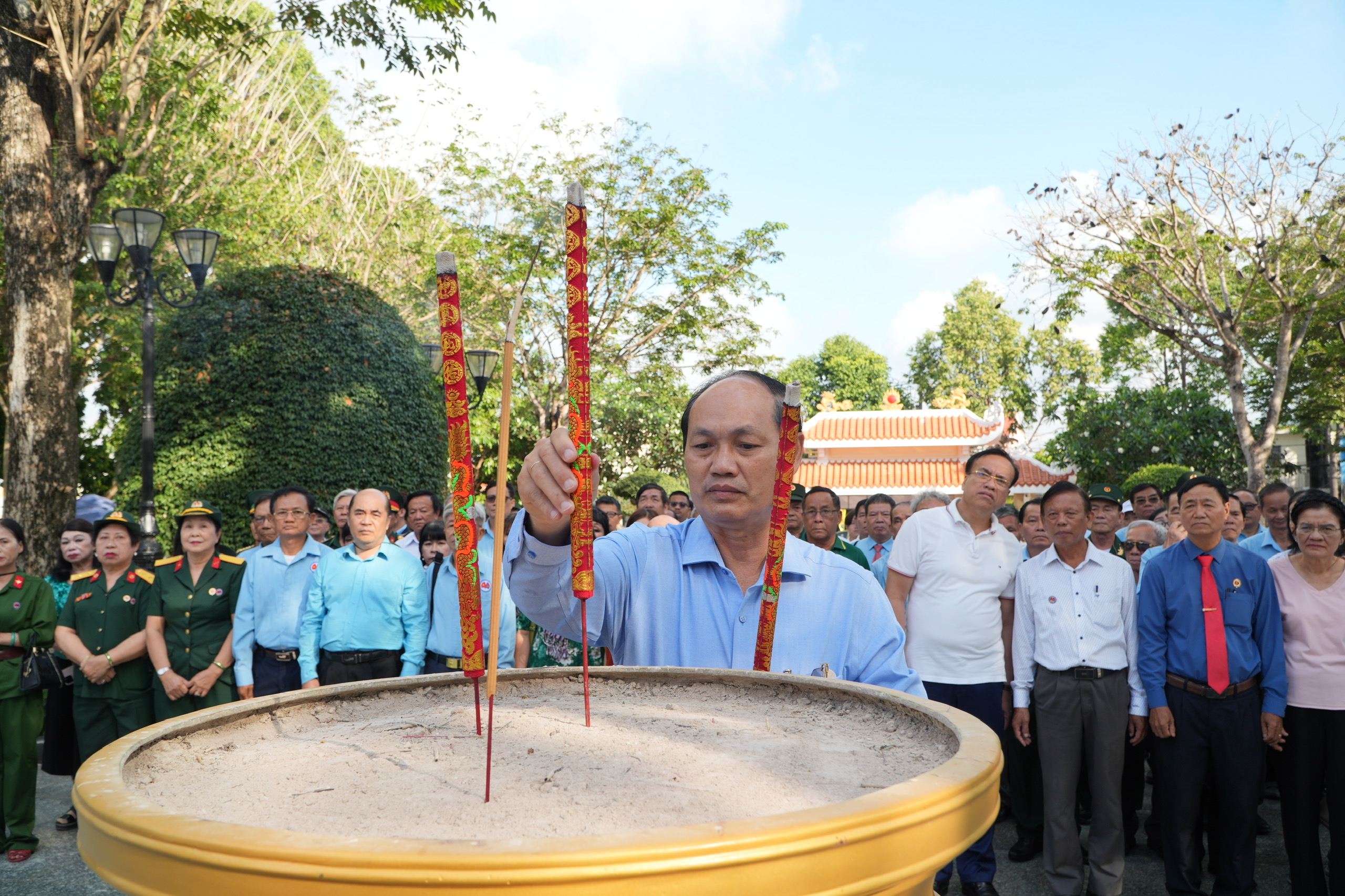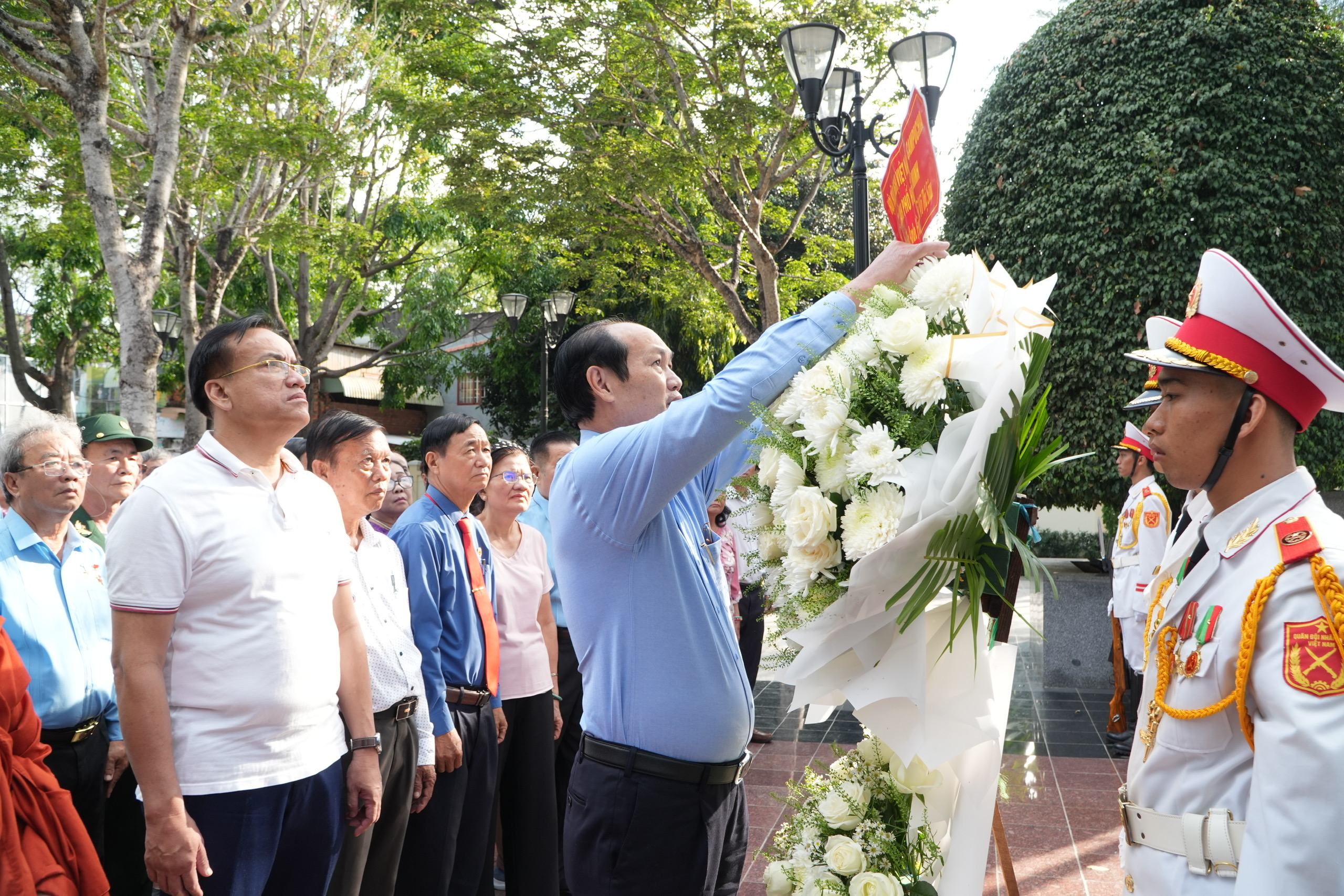 Trong không khí trang nghiêm, trước tượng đài Anh hùng liệt sĩ Võ Thị Sáu, đoàn đại biểu đã dành phút mặc niệm, thành kính dâng hoa, dâng hương, bày tỏ lòng tri ân sâu sắc đối với sự hy sinh anh dũng của các Anh hùng liệt sĩ vì sự nghiệp đấu tranh giải phóng dân tộc, thống nhất đất nước.