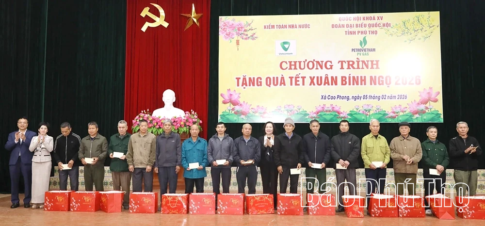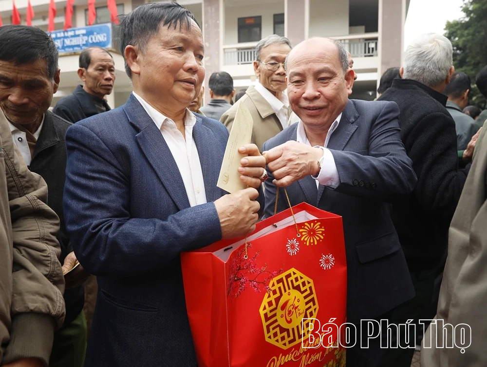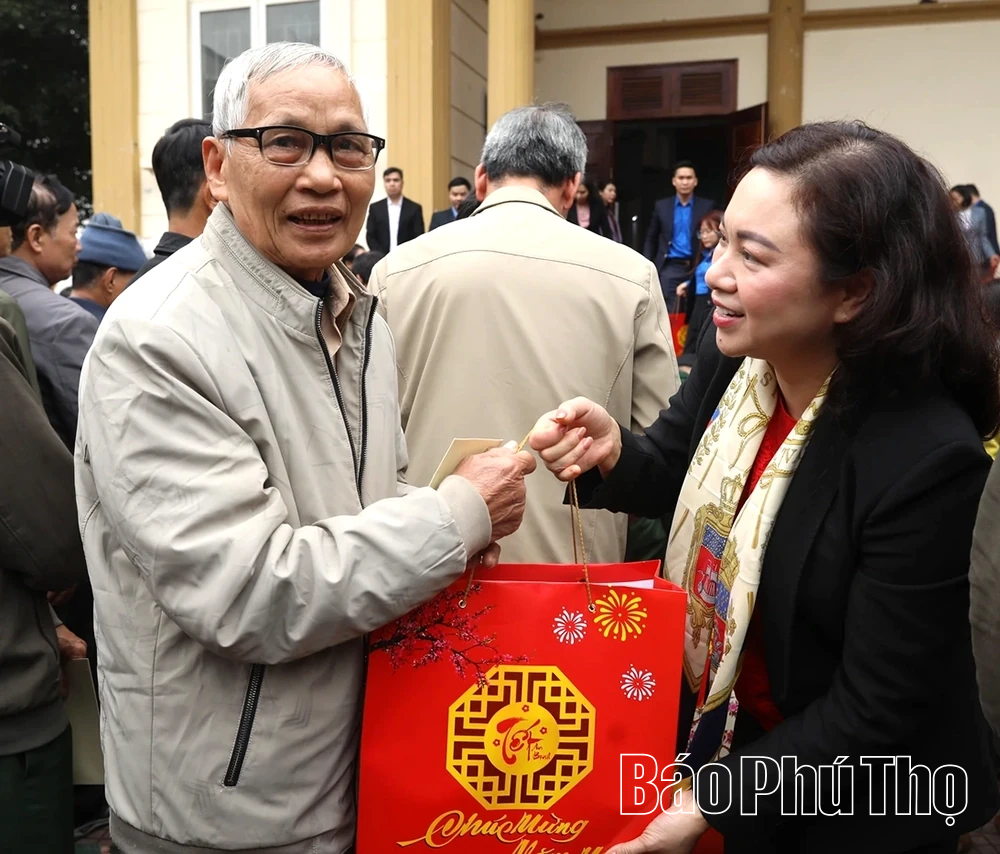 Các đồng chí: Phó Chủ nhiệm Ủy ban Kinh tế và Tài chính của Quốc hội Nguyễn Thị Phú Hà; Phó Chủ tịch HĐND tỉnh Nguyễn Thị Cẩm Phương trao quà Tết tại xã Cao Phong.