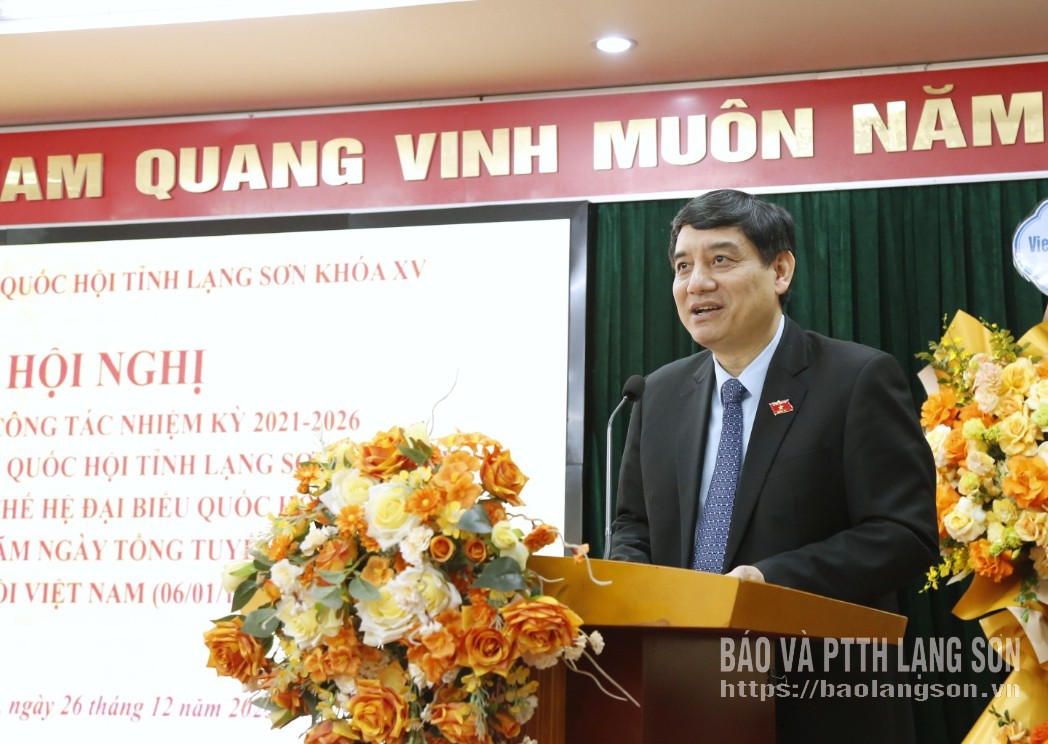 Phát biểu tại hội nghị, đồng chí Nguyễn Đắc Vinh, Chủ nhiệm Ủy ban Văn hóa và Xã hội của Quốc hội nhấn mạnh: Quốc hội khóa XV diễn ra trong bối cảnh đất nước phải đối mặt với nhiều khó khăn, thách thức. Các kỳ họp Quốc hội với khối lượng công việc lớn, cùng nhiều vấn đề quan trọng, nhiều nội dung mới, phức tạp, chưa từng có tiền lệ. Dưới sự lãnh đạo quyết liệt của Quốc hội, sự tận tâm của các ĐBQH, Quốc hội đã đạt được nhiều kết quả toàn diện. Trong đó có sự đóng góp tích cực của Đoàn ĐBQH tỉnh Lạng Sơn. Đồng chí chúc mừng, biểu dương những thành tích mà Đoàn ĐBQH tỉnh Lạng Sơn khóa XV đã đạt được trong nhiệm kỳ qua.