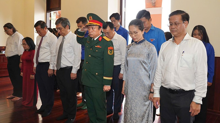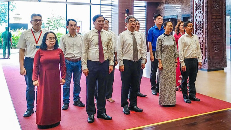 Đoàn đại biểu Thành phố Hồ Chí Minh dành một phút mặc niệm tưởng nhớ Chủ tịch Hồ Chí Minh tại Bảo tàng Hồ Chí Minh, chi nhánh Thành phố Hồ Chí Minh. (Ảnh: QUỐC THANH)