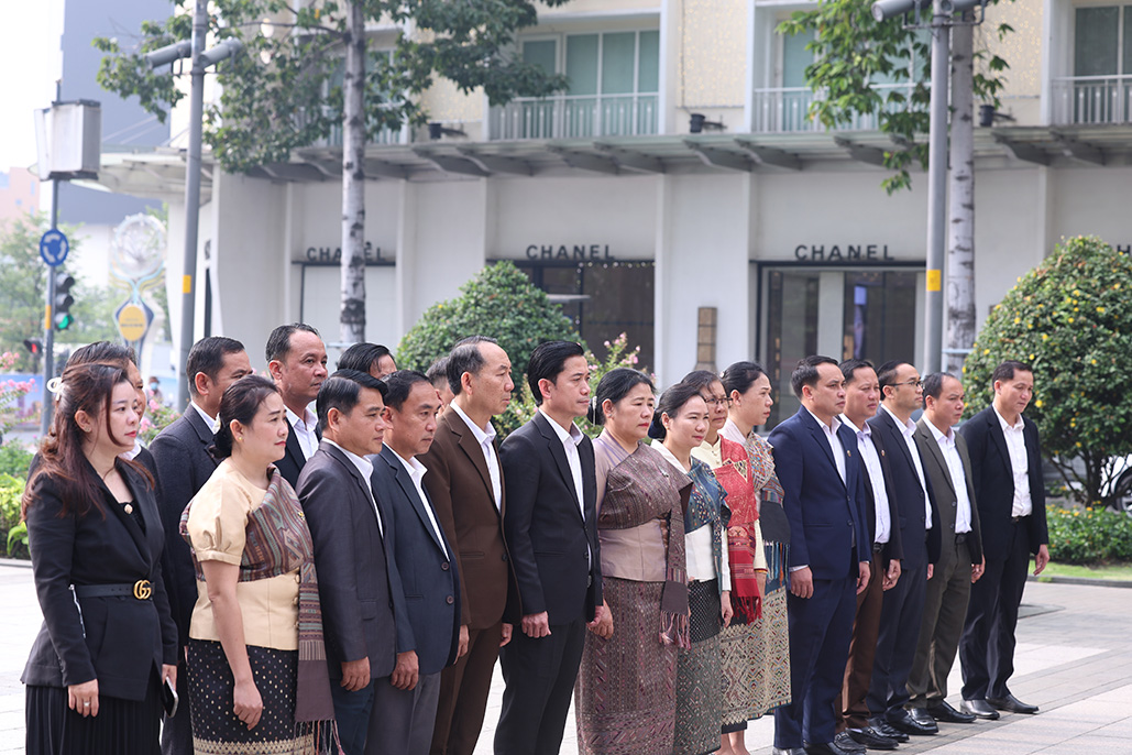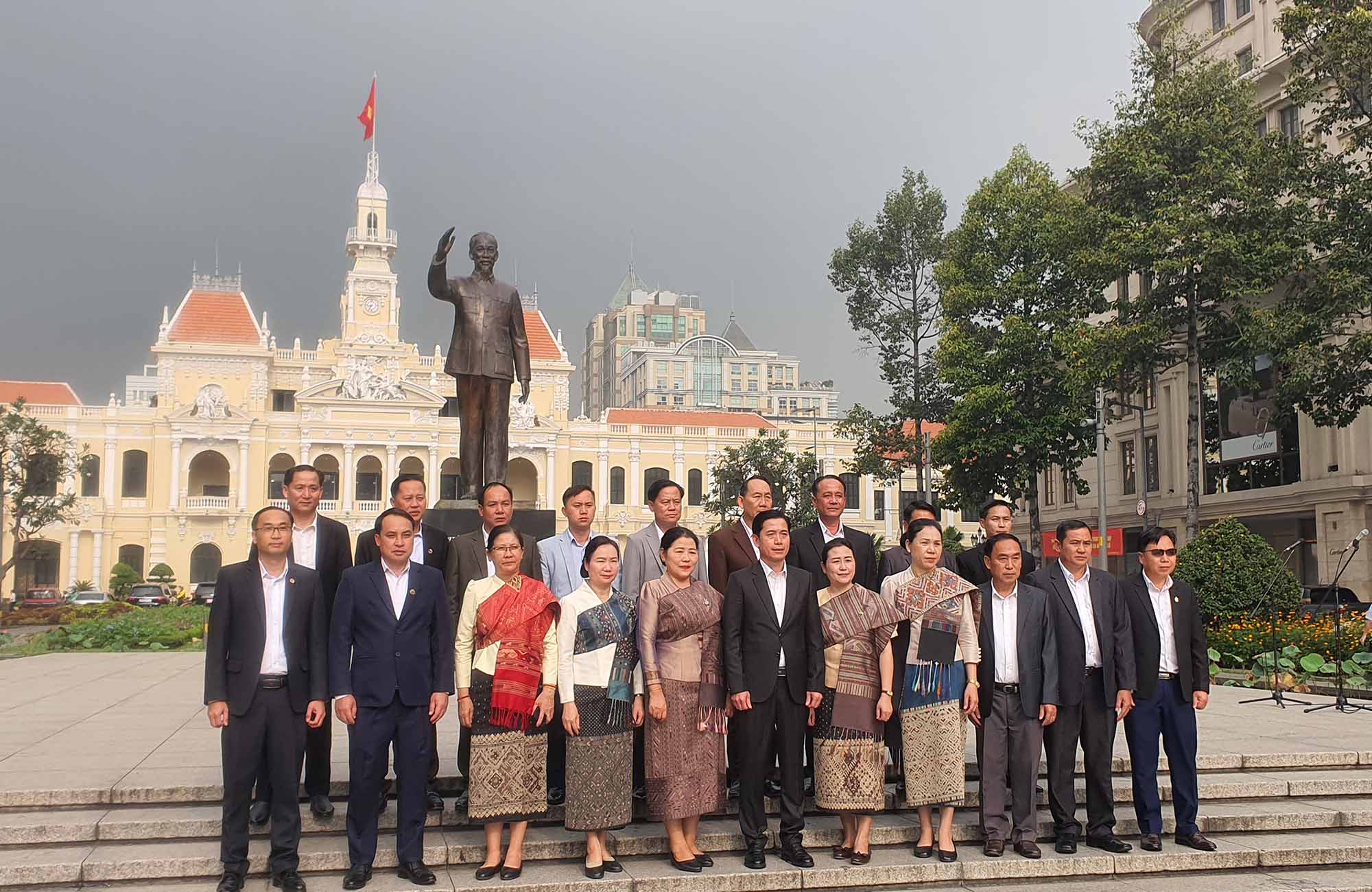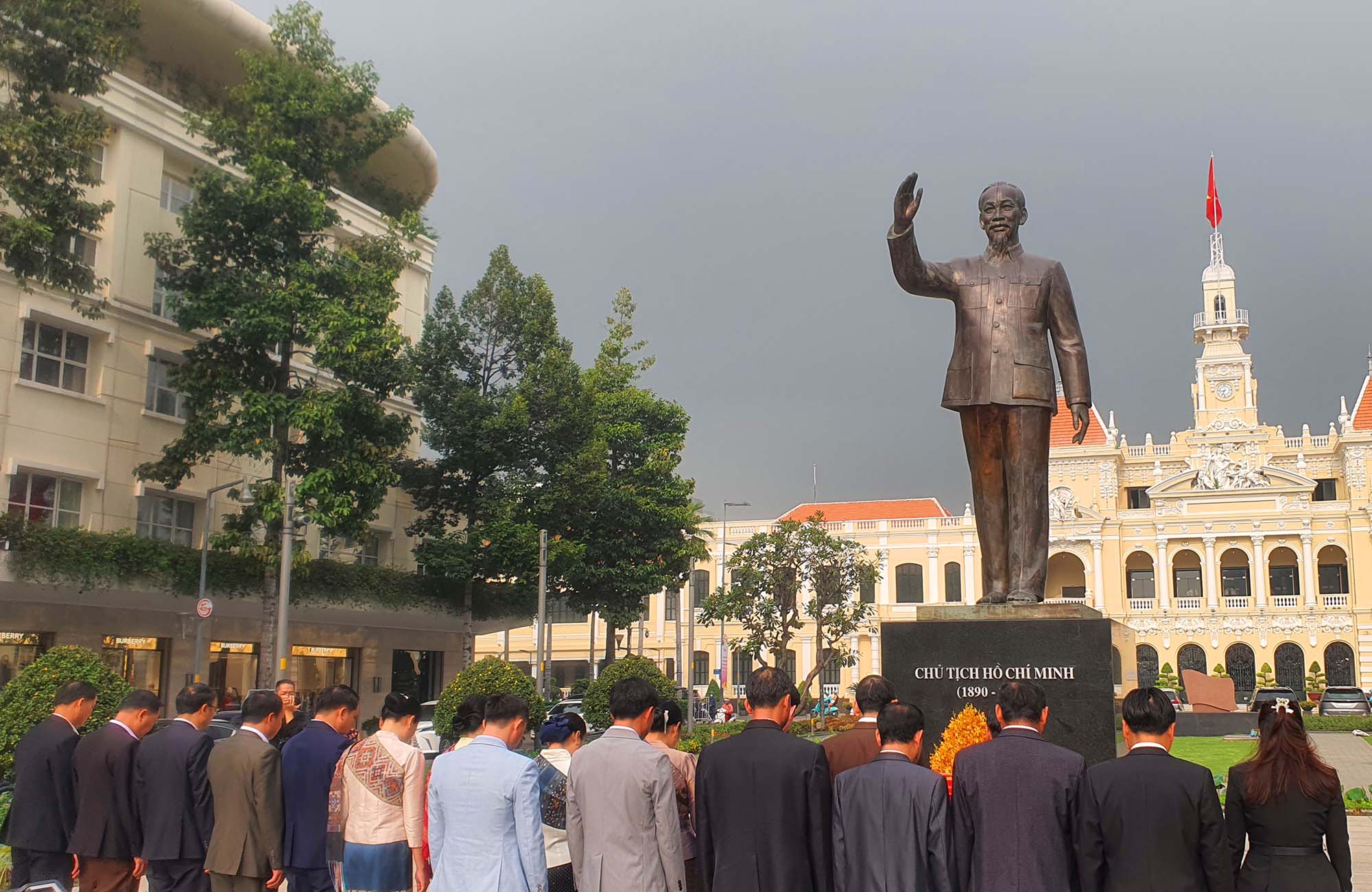 Đoàn chụp ảnh kỷ niệm trước Tượng đài Chủ tịch Hồ Chí Minh. Sự kiện diễn ra trong khuôn khổ chuyến thăm và làm việc của Đoàn đại biểu tỉnh Hủa Phăn tại TP.HCM từ ngày 16 đến 20/12/2025.