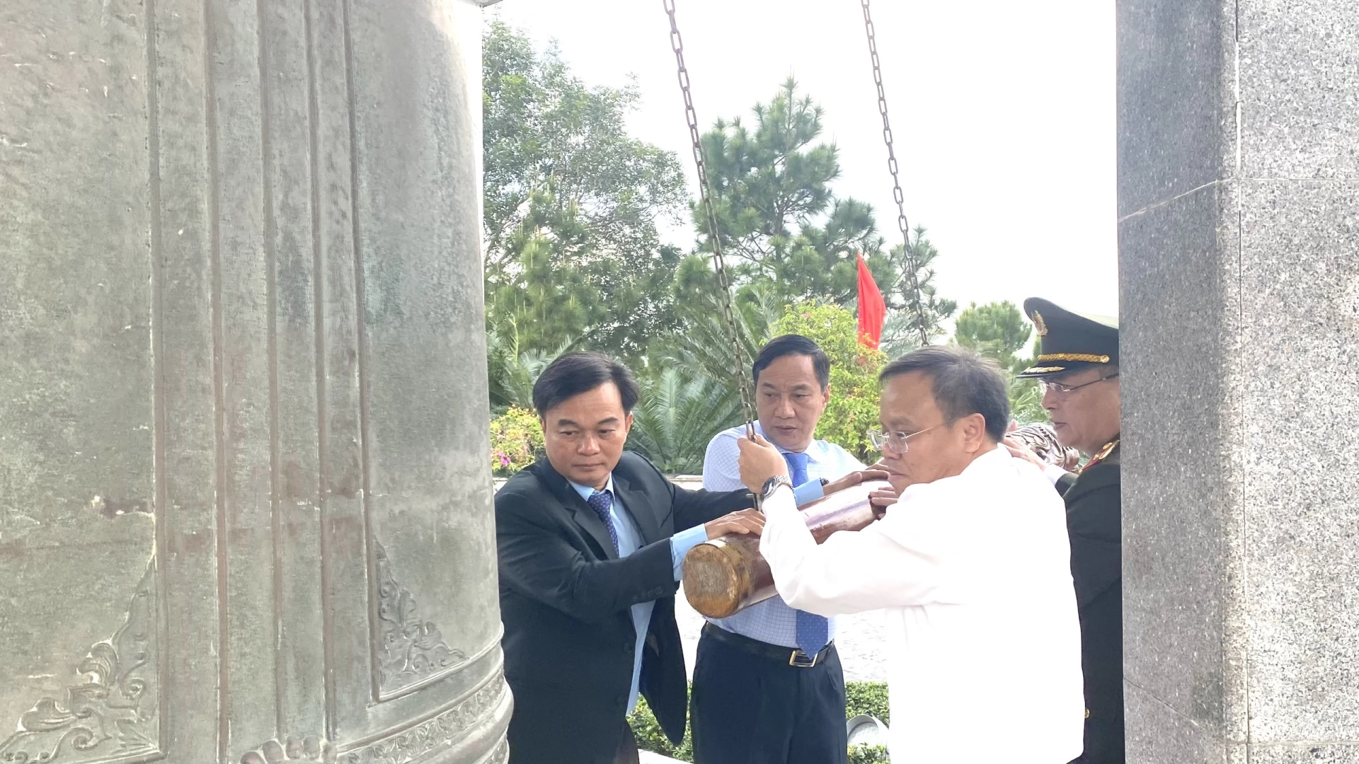 Các đồng chí lãnh đạo tỉnh thực hiện nghi thức thỉnh chuông tại Nghĩa trang liệt sĩ quốc gia Đường 9 - Ảnh: N.L