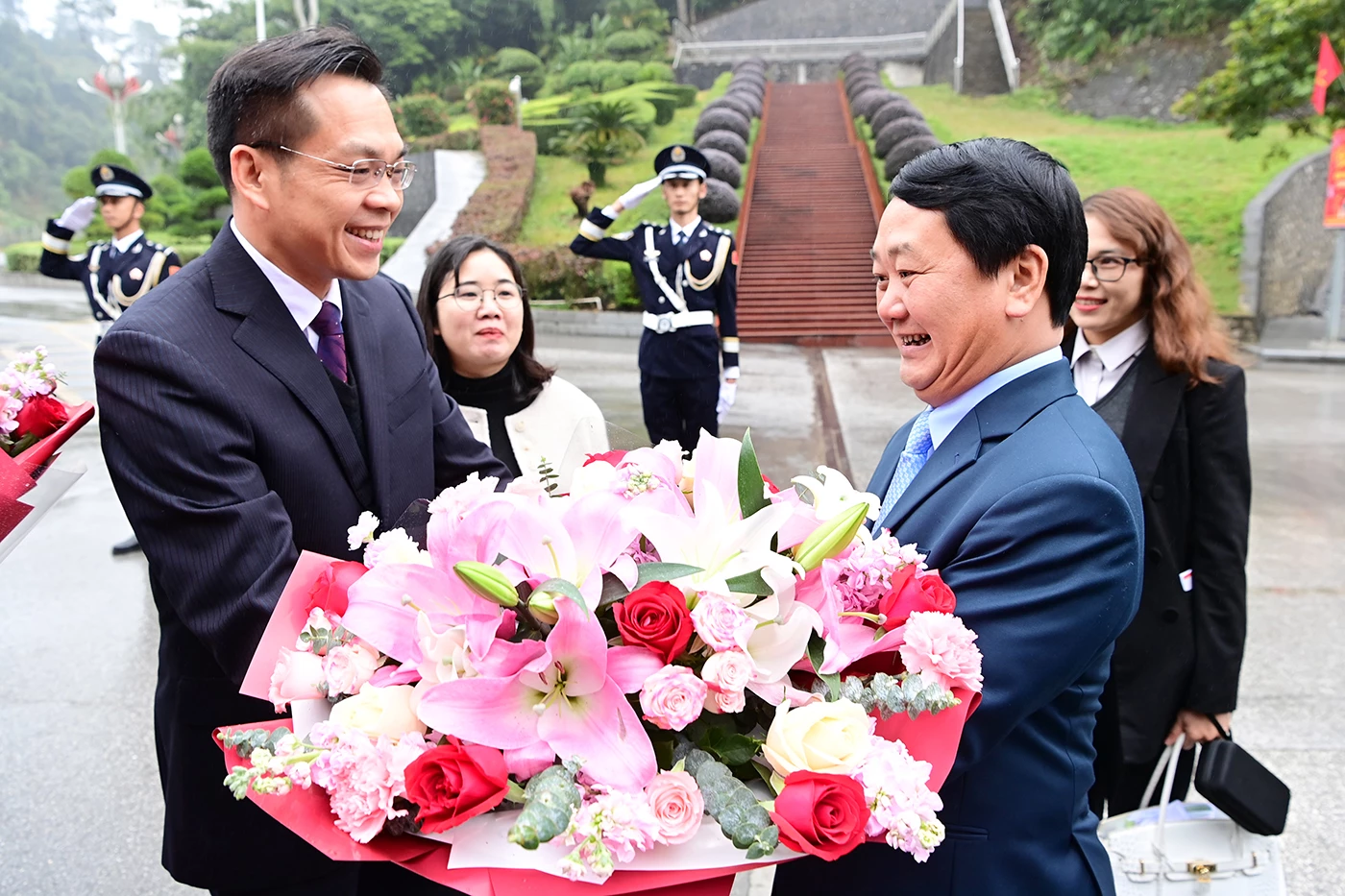 Đồng chí Bàng Xuân Triệu, Phó Thị trưởng Chính quyền nhân dân thành phố Bách Sắc tặng hoa đón đồng chí Hầu A Lềnh, Ủy viên BCH Trung ương Đảng, Bí thư Tỉnh ủy và đoàn công tác tỉnh Tuyên Quang.