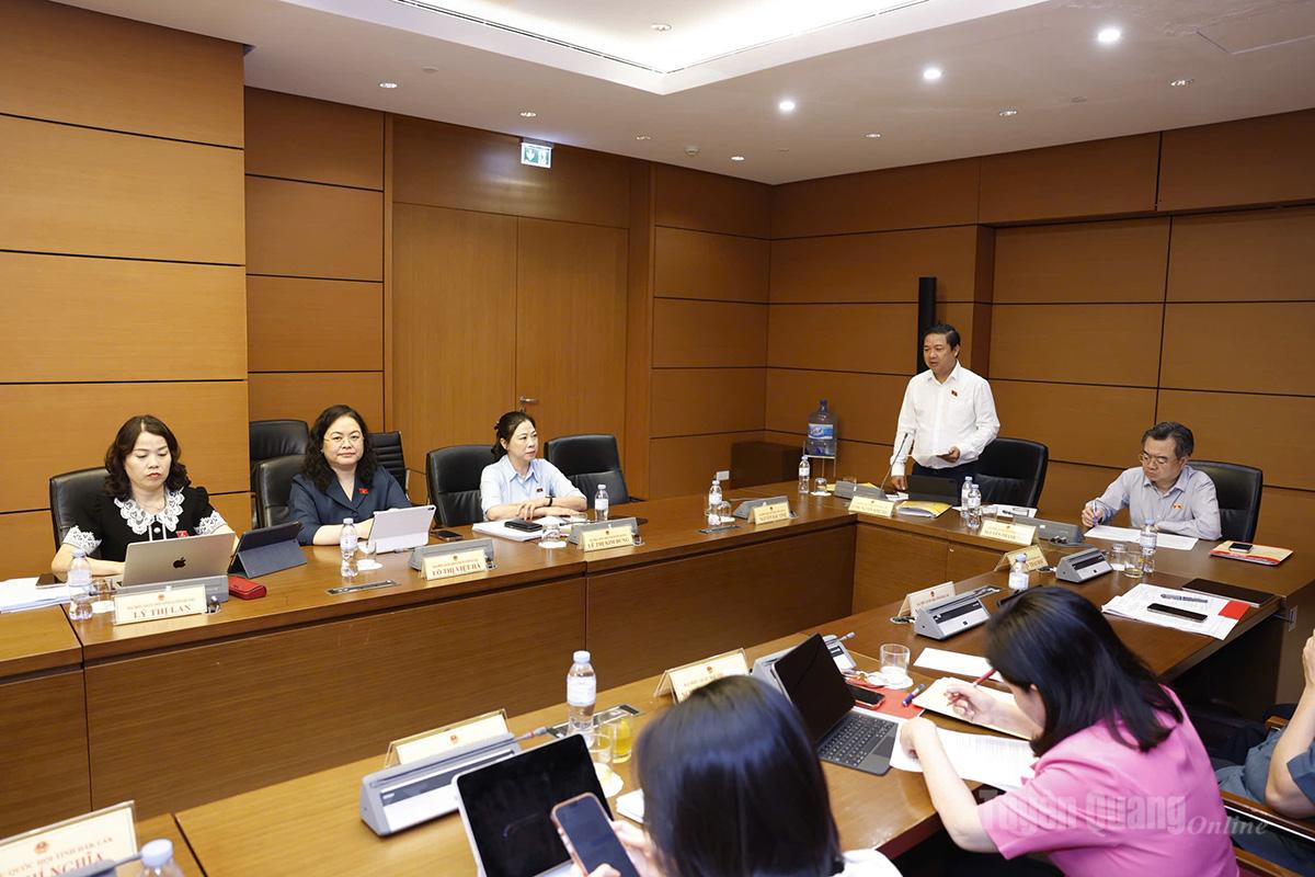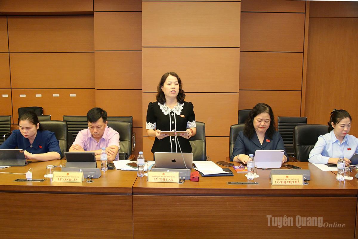 Đại biểu Lý Thị Lan, Ủy viên Ban Thường vụ Tỉnh ủy, Phó Trưởng đoàn hoạt động chuyên trách Đoàn ĐBQH tỉnh Tuyên Quang khóa XVI thảo luận..