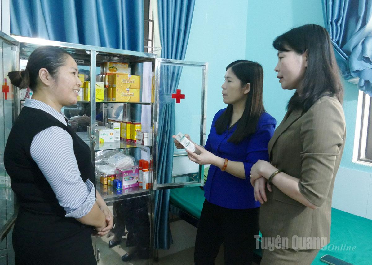 Đoàn giám sát kiểm tra tủ thuốc y tế tại Trường Mầm non Hùng An, xã Hùng An.