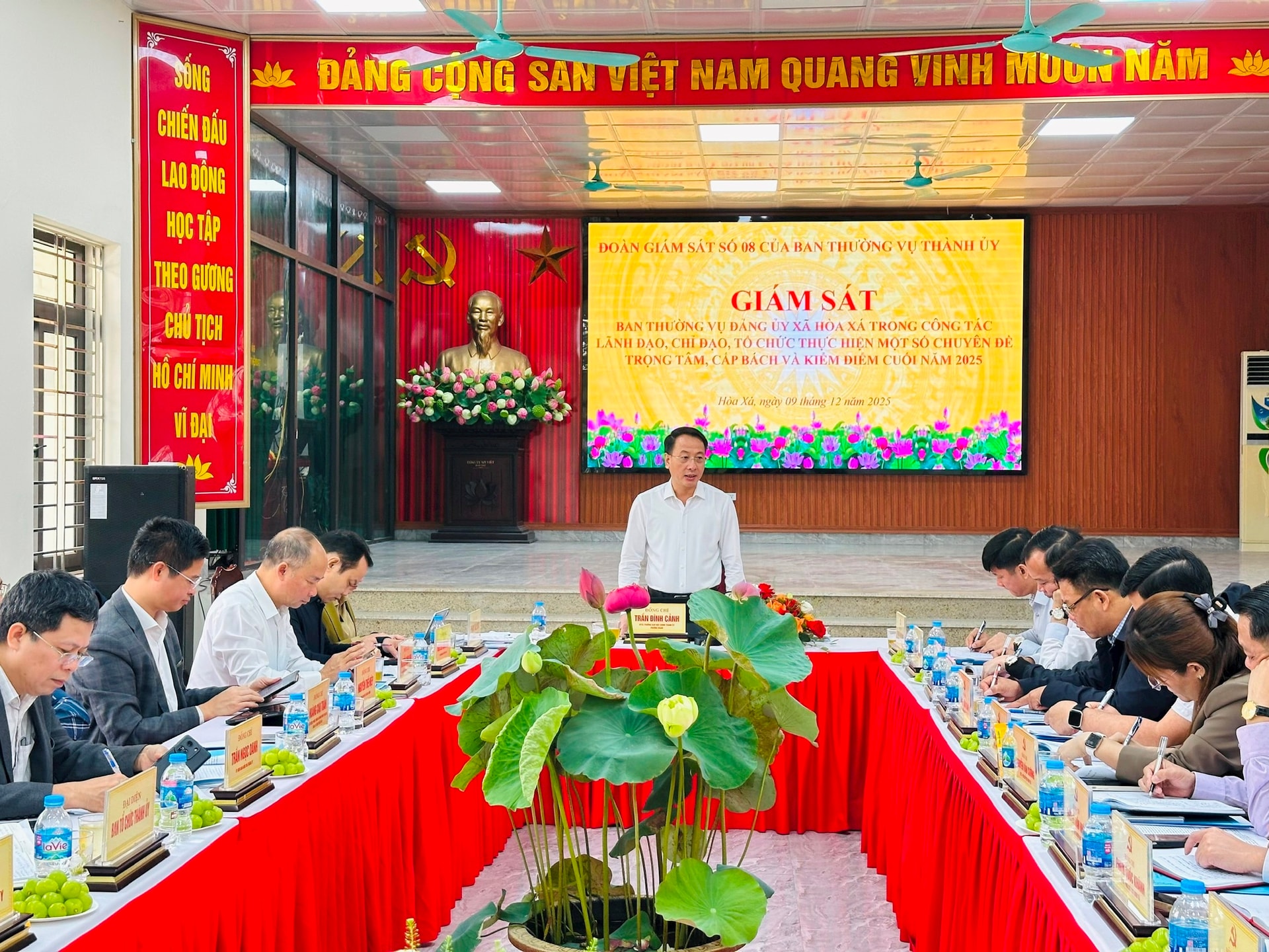 Đoàn giám sát số 08 của Ban Thường vụ Thành ủy Hà Nội đã tập trung vào 8 chuyên đề cấp bách liên quan đến phân cấp gắn với chuyển đổi số; giải ngân đầu tư công; công tác giải phóng mặt bằng; xử lý dự án chậm tiến độ; quản lý biên chế, tài sản công và giải quyết 5 nhóm vấn đề dân sinh bức xúc trong giai đoạn từ ngày 1-7 đến ngày 3-12-2025.