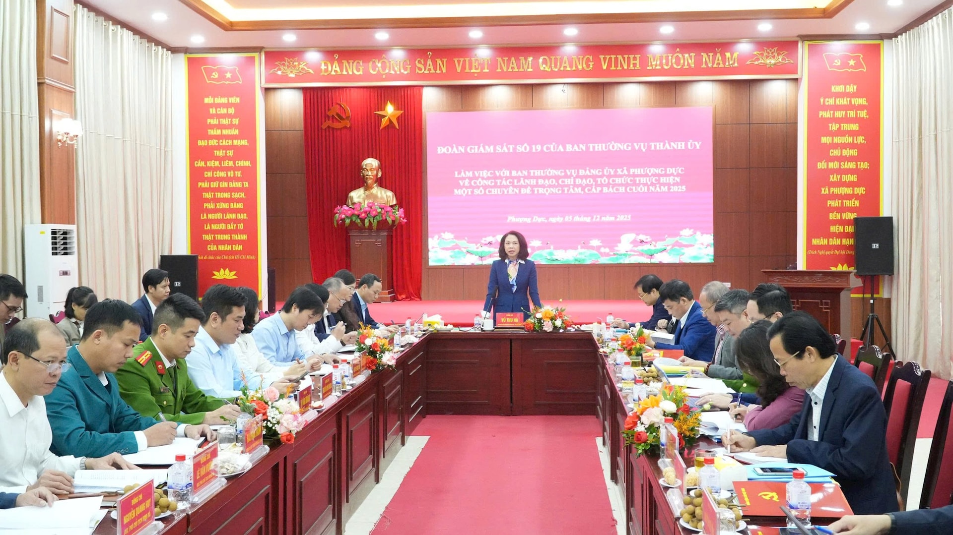 Kết luận buổi làm việc, Phó Chủ tịch UBND thành phố Vũ Thu Hà đánh giá, Đoàn giám sát số 19 đồng thời thực hiện nhiệm vụ kiểm điểm cuối năm, qua đó ghi nhận sự nỗ lực của cả hệ thống chính trị xã Phượng Dực trong triển khai các nhiệm vụ cấp bách năm 2025. Đồng chí đề nghị xã tiếp tục tập trung, làm rõ trách nhiệm từng tổ chức, cá nhân trong từng phần việc; khẩn trương tiếp thu ý kiến của đoàn để hoàn thiện báo cáo, bảo đảm “rõ mô hình, rõ việc, rõ người thực hiện”.