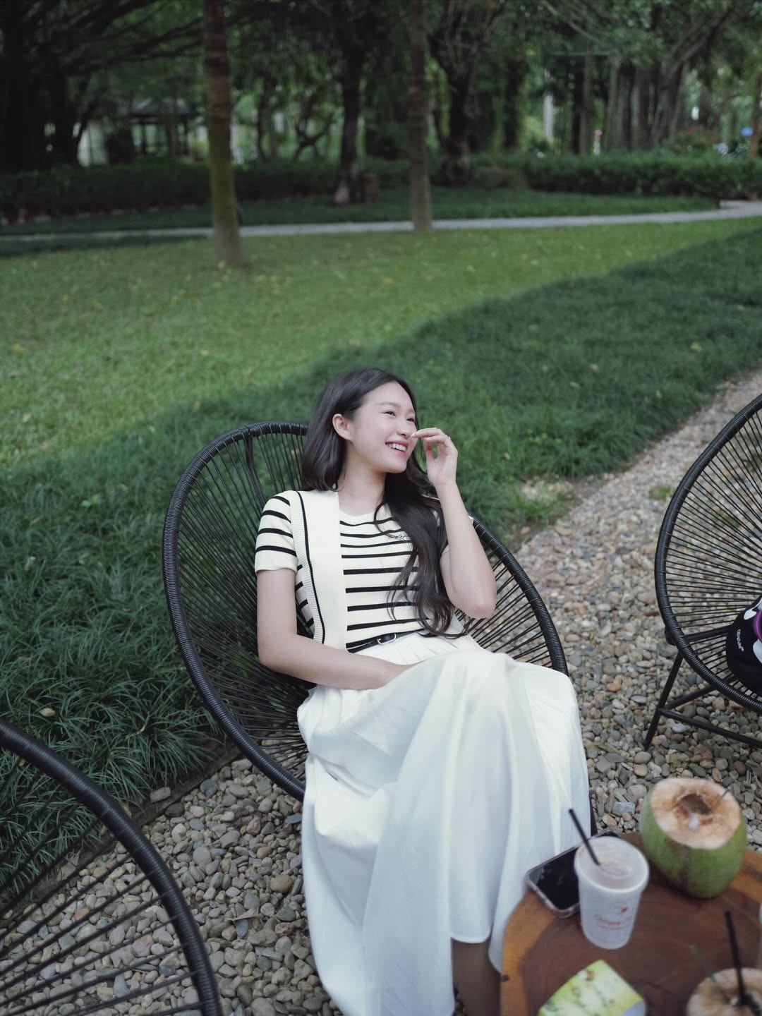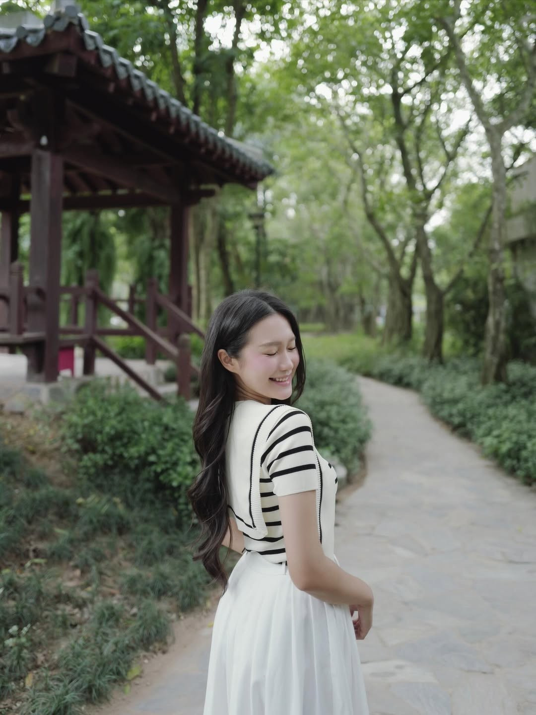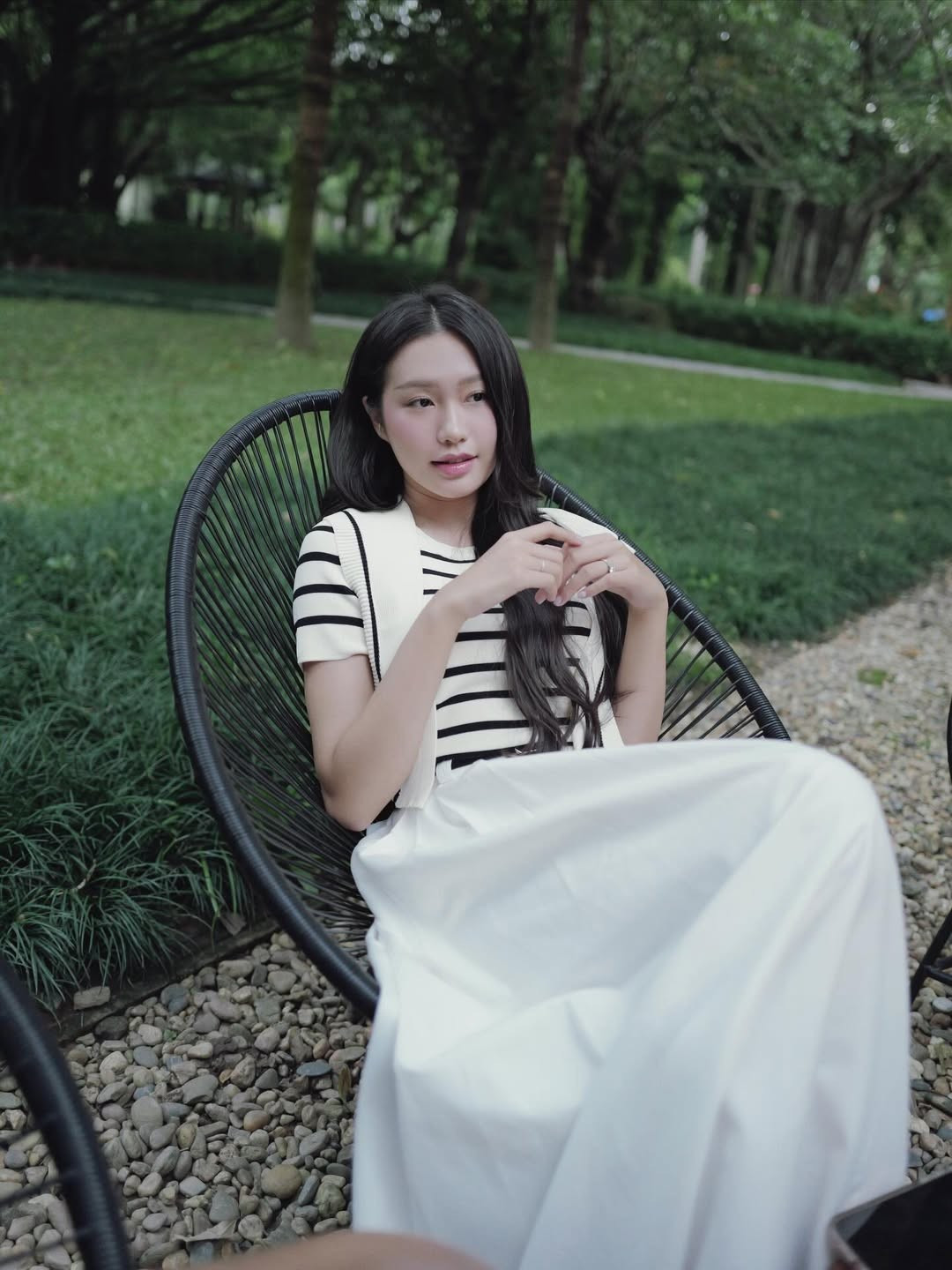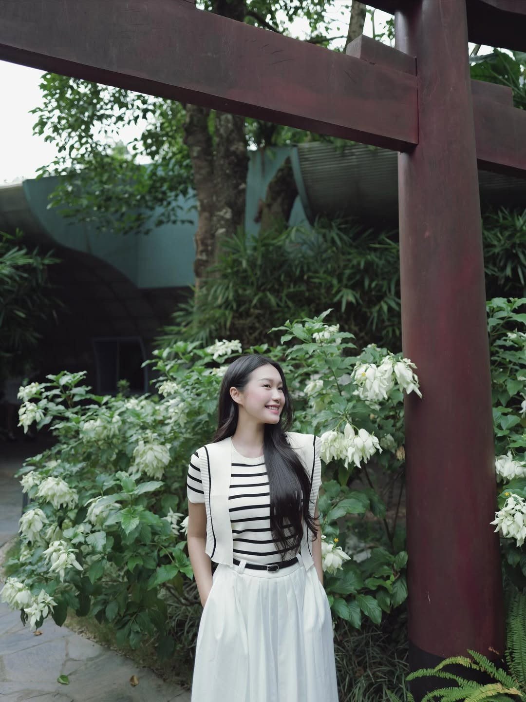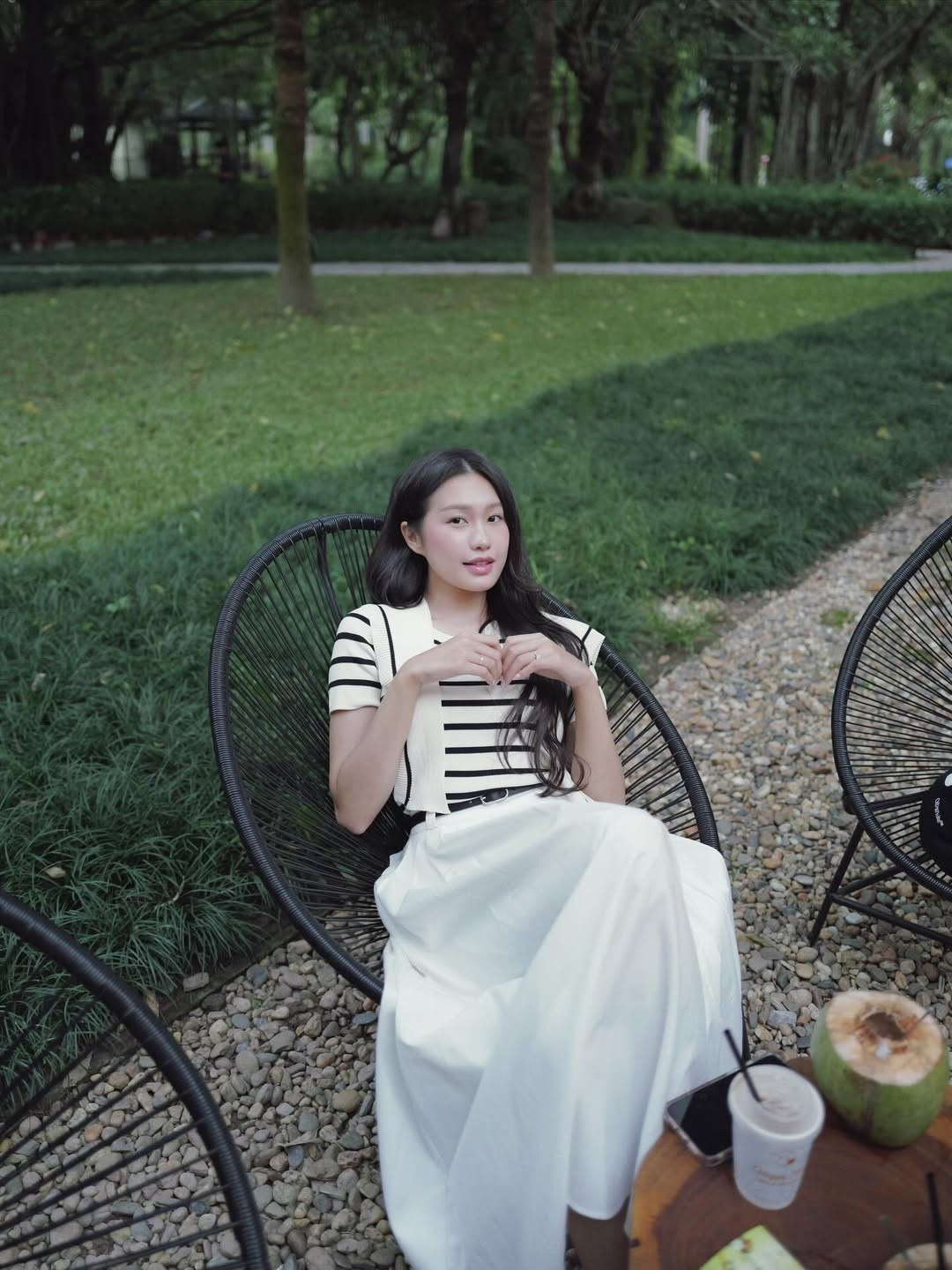 Cô diện chiếc áo thun cộc tay với họa tiết kẻ sọc ngang đen-trắng, kết hợp cùng chân váy màu trắng tinh khôi, với độ xòe nhẹ nhàng, giúp cô khoe dáng một cách khéo léo, đồng thời mang lại vẻ ngoài bay bổng, thướt tha. (Ảnh: IGNV)