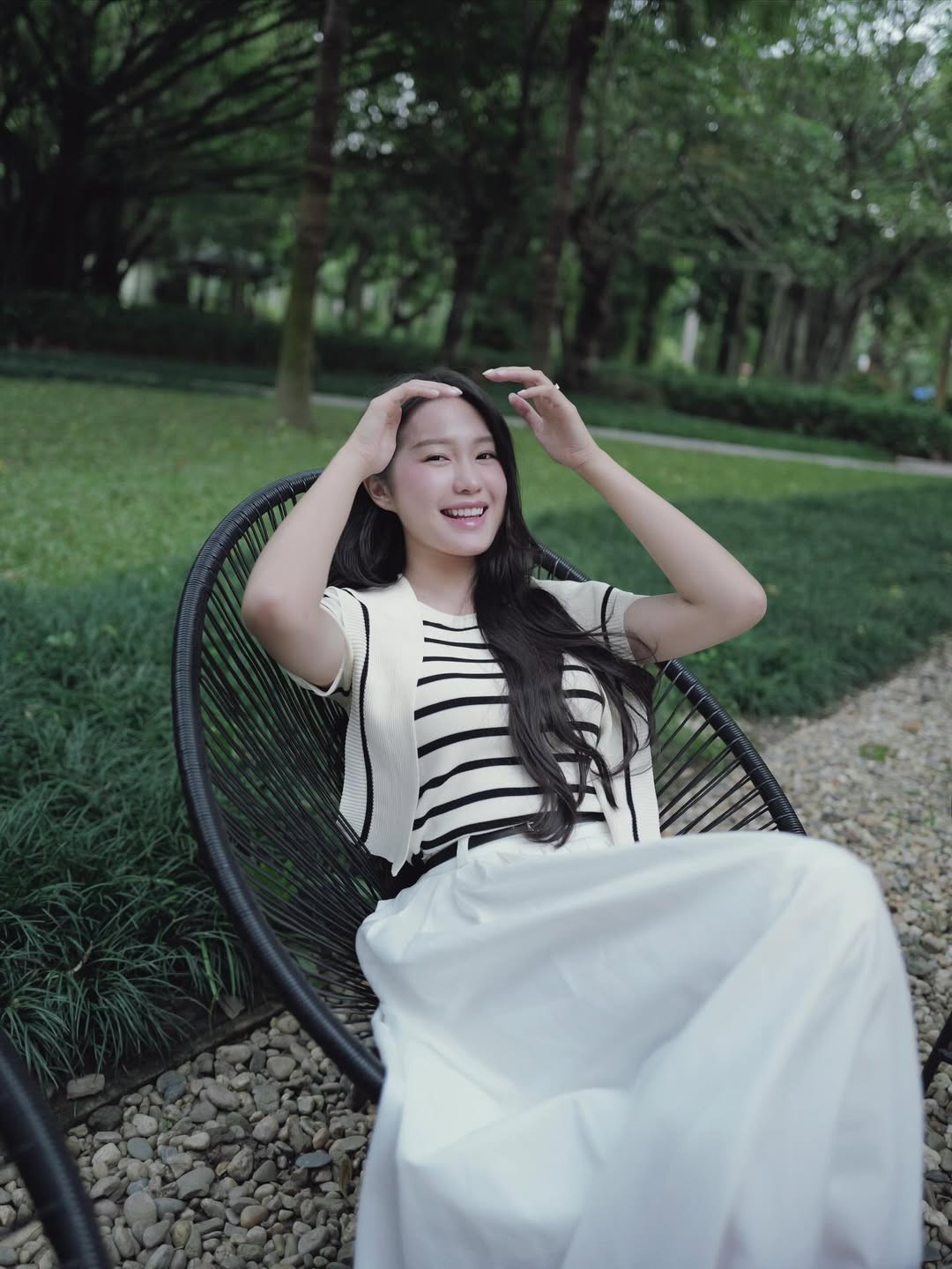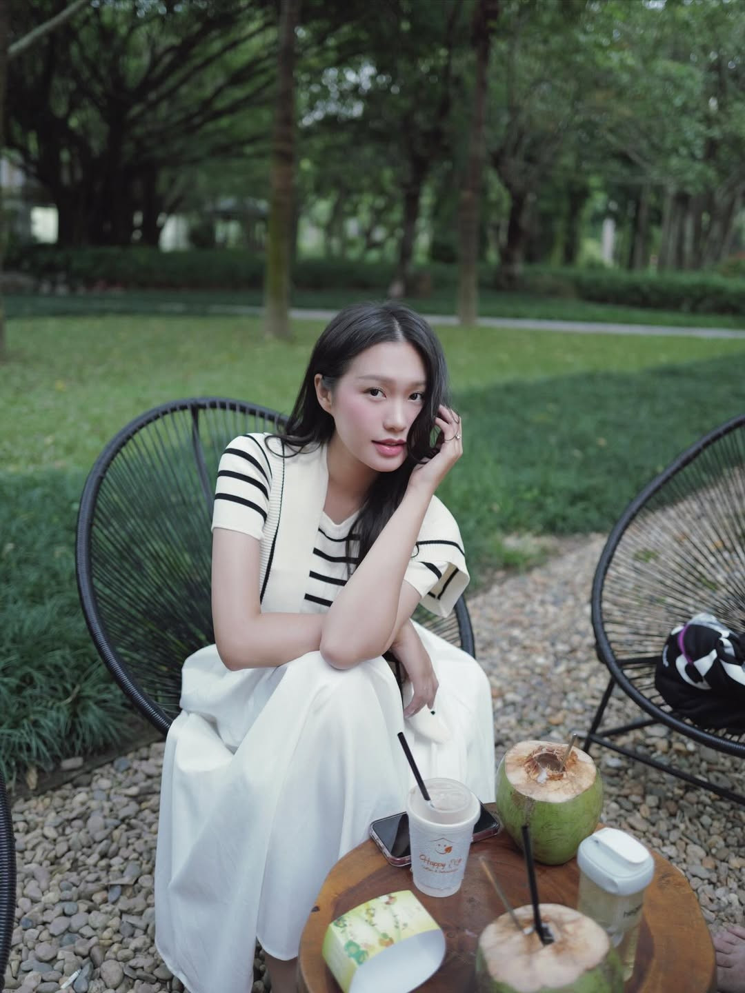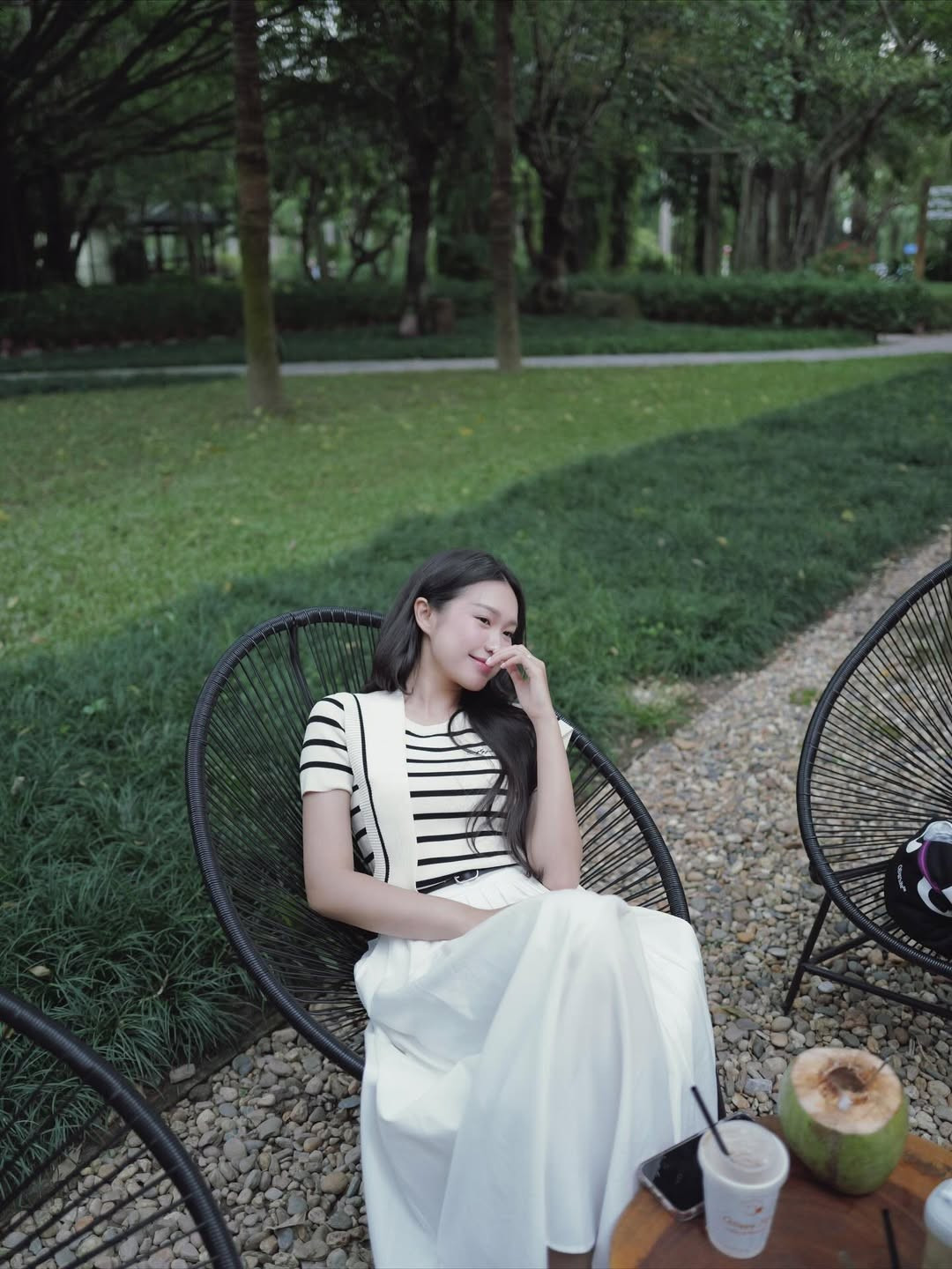 Trong loạt ảnh được chia sẻ, Doãn Hải My chọn bối cảnh là một không gian xanh mát, yên bình với nhiều cây xanh. Sự kết hợp giữa trang phục và khung cảnh đã tạo nên một tổng thể hài hòa, tôn lên vẻ đẹp dịu dàng, lãng mạn của cô. (Ảnh: IGNV)