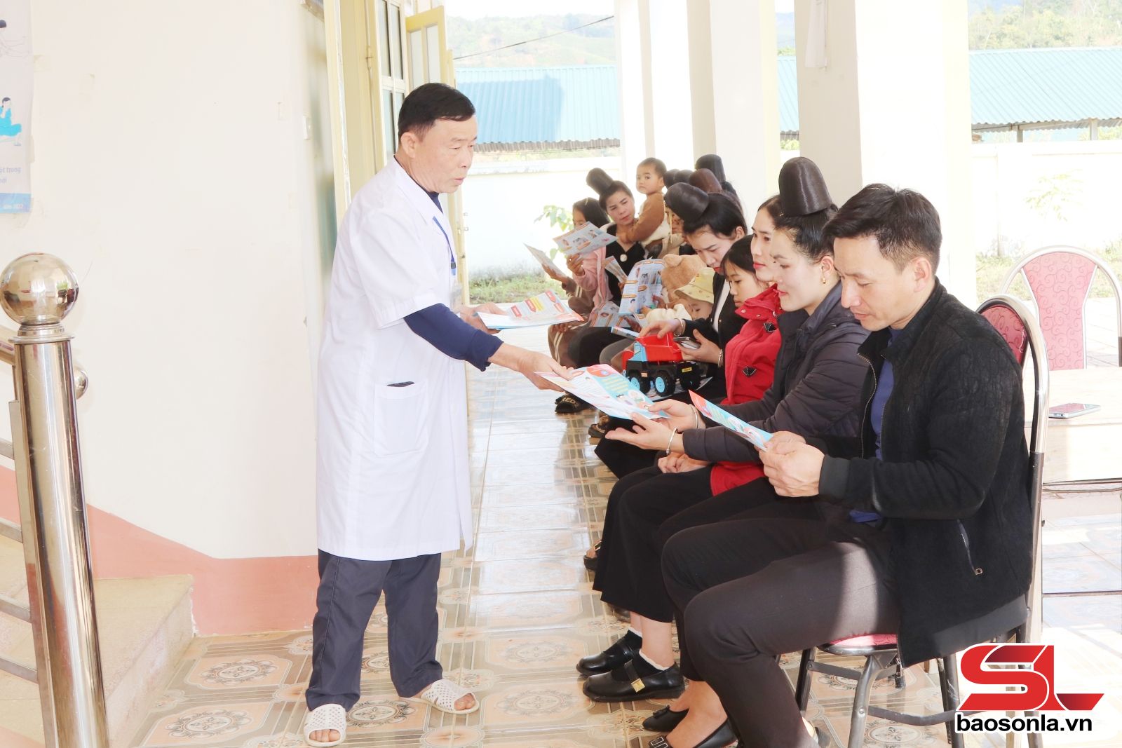 Cán bộ Trạm y tế xã Thuận Châu phát tờ rơi tuyên truyền về phòng, chống HIV/AIDS