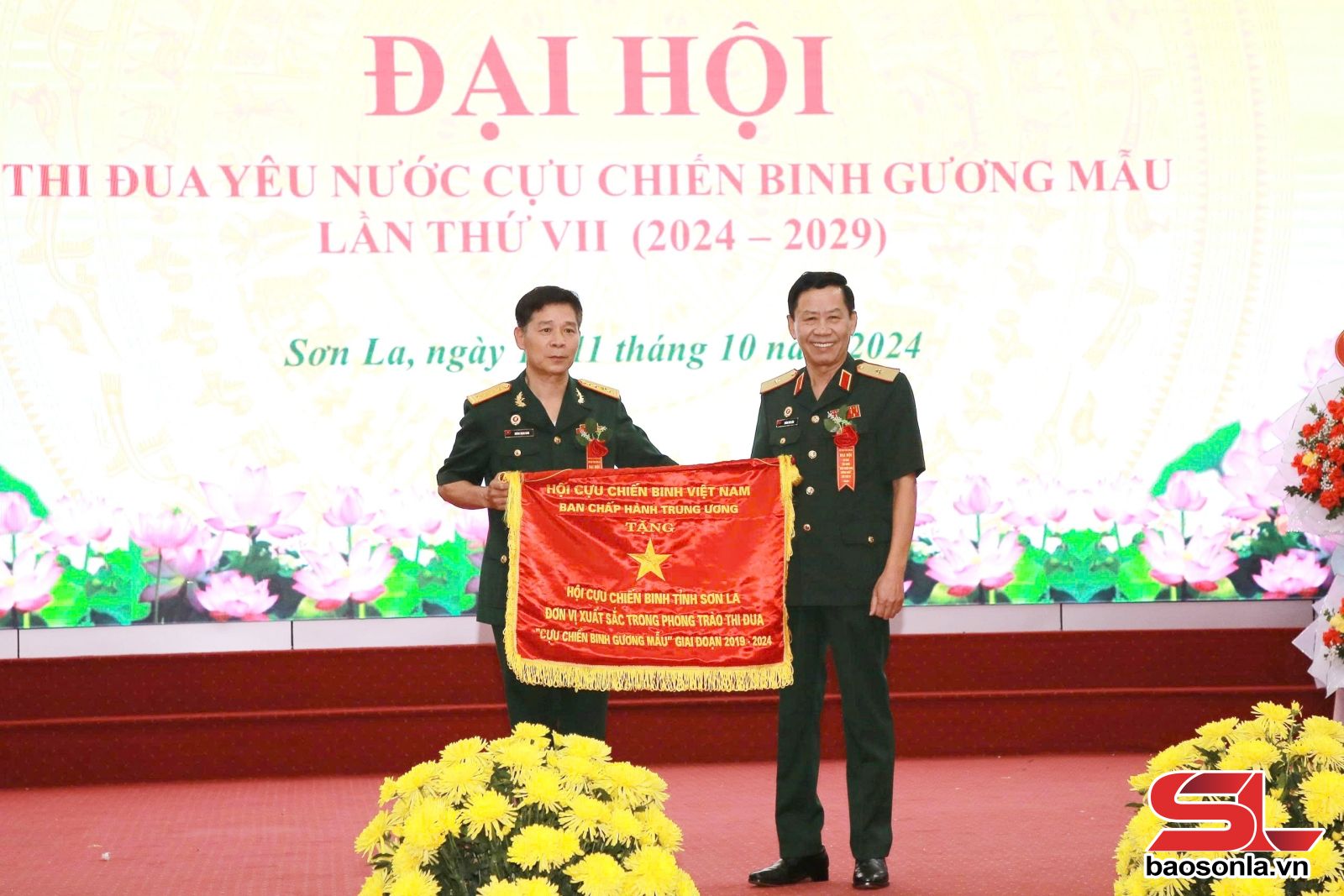 Đại diện Trung ương Hội CCB Việt Nam trao Cờ thi đua cho Hội CCB tỉnh tại Đại hội thi đua yêu nước “Cựu chiến binh gương mẫu” lần thứ VII. Ảnh: PV