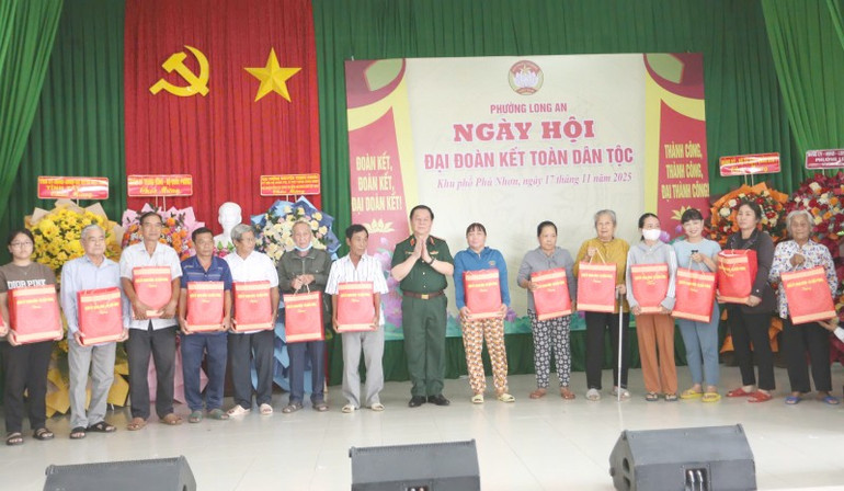 Dịp này, Đại tướng Nguyễn Trọng Nghĩa trao quà của Quân ủy Trung ương, Bộ Quốc phòng cho các gia đình chính sách, hộ nghèo, cận nghèo trên địa bàn khu phố Phú Nhơn, phường Long An, Tây Ninh.