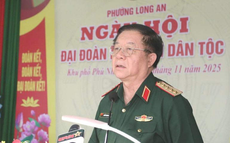 Phát biểu tại Ngày hội Đại đoàn kết toàn dân tộc khu phố Phú Nhơn, Đại tướng Nguyễn Trọng Nghĩa chúc mừng sự phát triển mạnh mẽ của tỉnh Tây Ninh thời gian qua và việc tổ chức thành công Đại hội Đảng bộ tỉnh Tây Ninh lần thứ I, nhiệm kỳ 2025-2030.