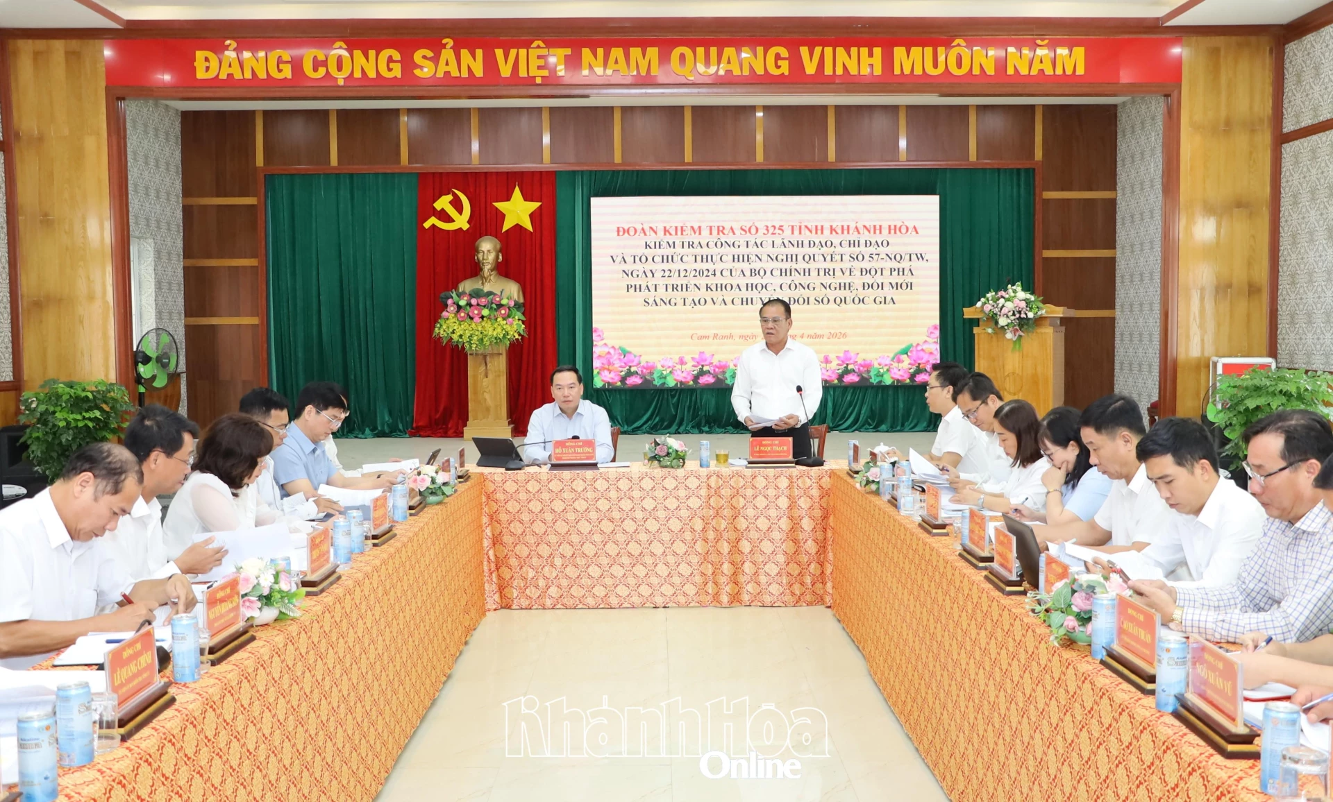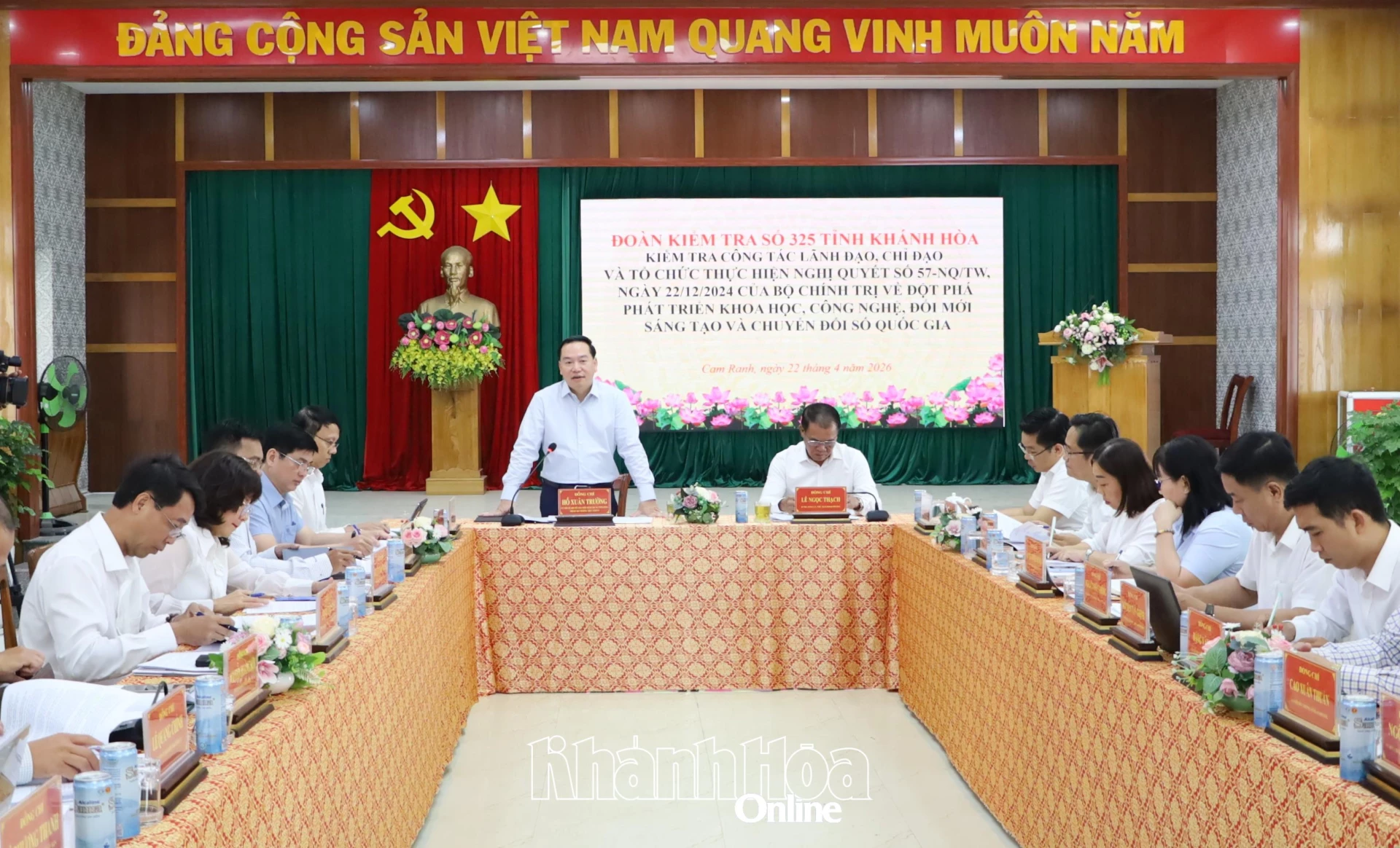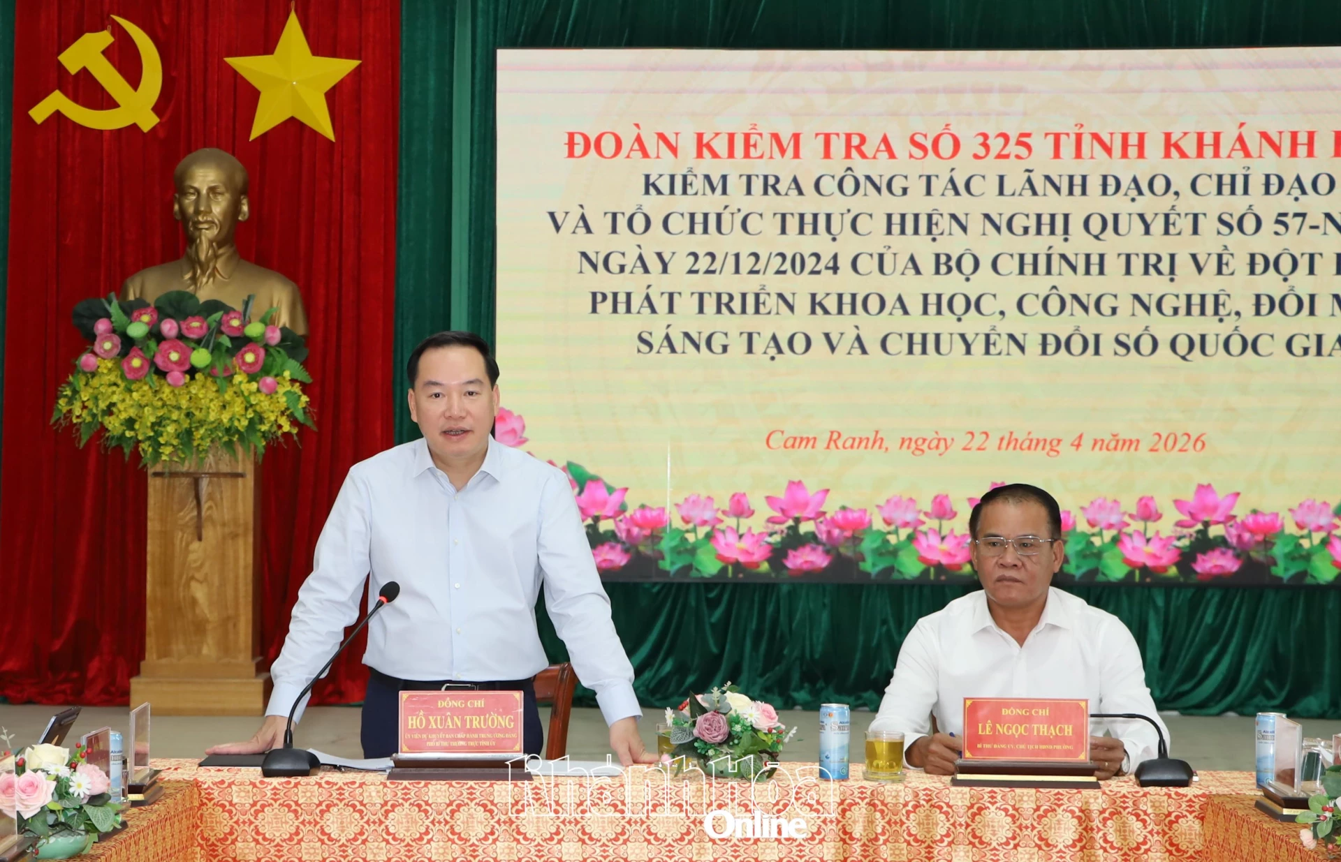 Sáng 22-4, Đoàn kiểm tra 325 của Ban Thường vụ Tỉnh ủy Khánh Hòa về kiểm tra công tác lãnh đạo, chỉ đạo và tổ chức thực hiện Nghị quyết số 57-NQ/TW, ngày 22-12-2024 của Bộ Chính trị về đột phá phát triển khoa học, công nghệ, đổi mới sáng tạo và chuyển đổi số quốc gia đối với Ban Thường vụ Đảng ủy 64 xã, phường và một số tổ chức, đảng viên do đồng chí Hồ Xuân Trường - Ủy viên dự khuyết Trung ương Đảng, Phó Bí thư Thường trực Tỉnh ủy làm Trưởng đoàn cùng các thành viên kiểm tra đối với Ban Thường vụ Đảng ủy phường Cam Ranh.