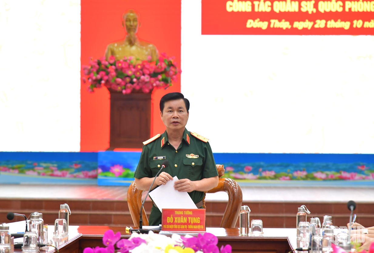 Trung tướng Đỗ Xuân Tụng, Phó chủ nhiệm Tổng cục Chính trị phát biểu chỉ đạo tại buổi kiểm tra tại Ban chỉ huy phòng thủ khu vực 3 - Cao Lãnh.