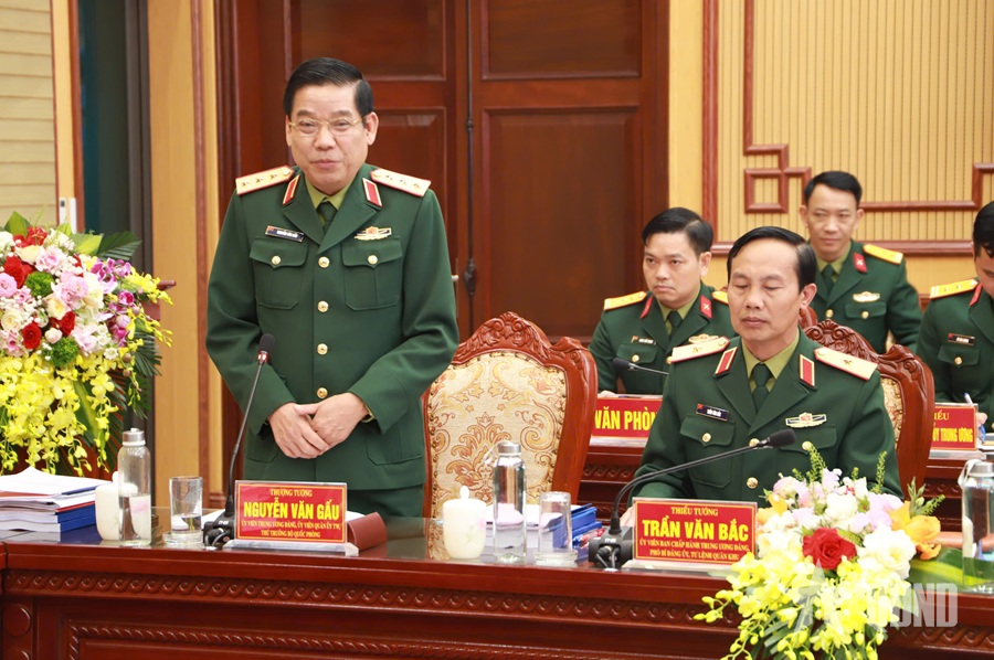 Thượng tướng Nguyễn Văn Gấu, Ủy viên Trung ương Đảng, Thứ trưởng Bộ Quốc phòng phát biểu tại buổi làm việc.