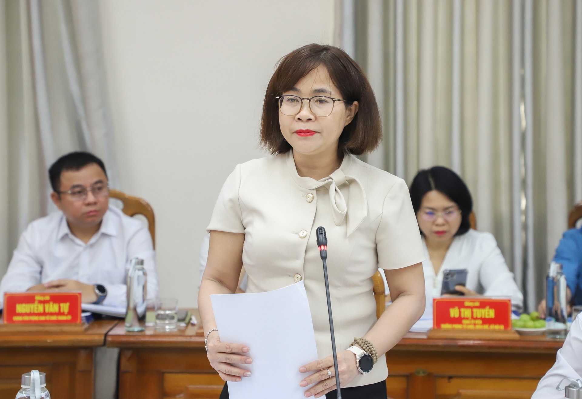Giám đốc Sở Nội vụ Trần Thị Kim Hoa báo cáo tại buổi làm việc. Ảnh: NGỌC PHÚ