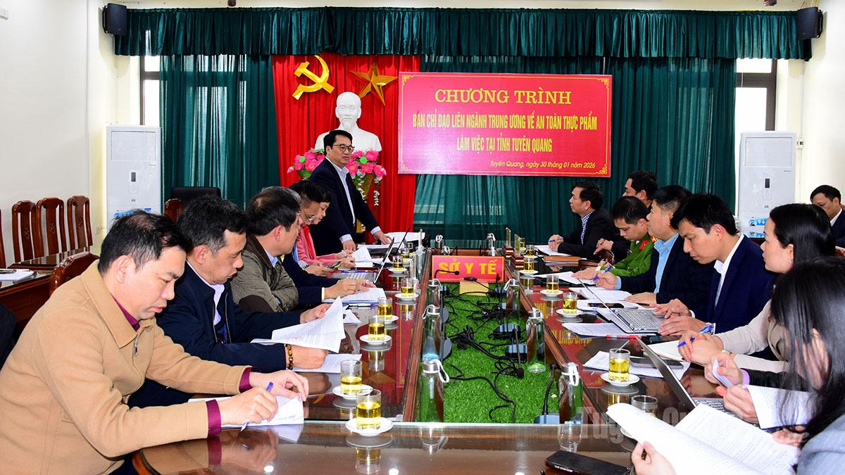 Tại buổi làm việc, đại diện Phòng An toàn thực phẩm, Sở Y tế đã báo cáo về công tác bảo đảm an toàn thực phẩm trên địa bàn tỉnh. Năm 2025, toàn tỉnh đã thành lập 456 đoàn kiểm tra, trong đó: Cấp tỉnh 7 đoàn, cấp xã 449 đoàn; kiểm tra 11.784 lượt cơ sở, phát hiện 193 cơ sở vi phạm, xử phạt hành chính trên 1 tỷ đồng. Năm 2025, trên địa bàn tỉnh Tuyên Quang xảy ra 18 vụ ngộ độc thực phẩm, với 88 người mắc, trong đó có 11 vụ ngộ độc là do độc tố tự nhiên, 1 vụ ngộ độc do hóa học và 6 vụ ngộ độc do vi sinh. Bên cạnh đó, công tác thông tin, truyền thông về an toàn thực phẩm được chú trọng...