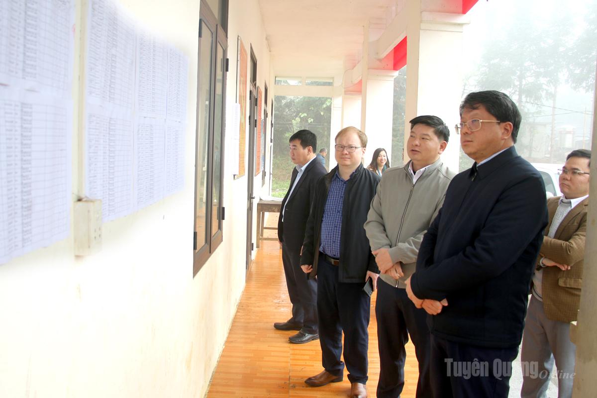 Đoàn kiểm tra danh sách cử tri niêm yết tại nhà văn hóa thôn Phiền Sủi, xã Giáp Trung.