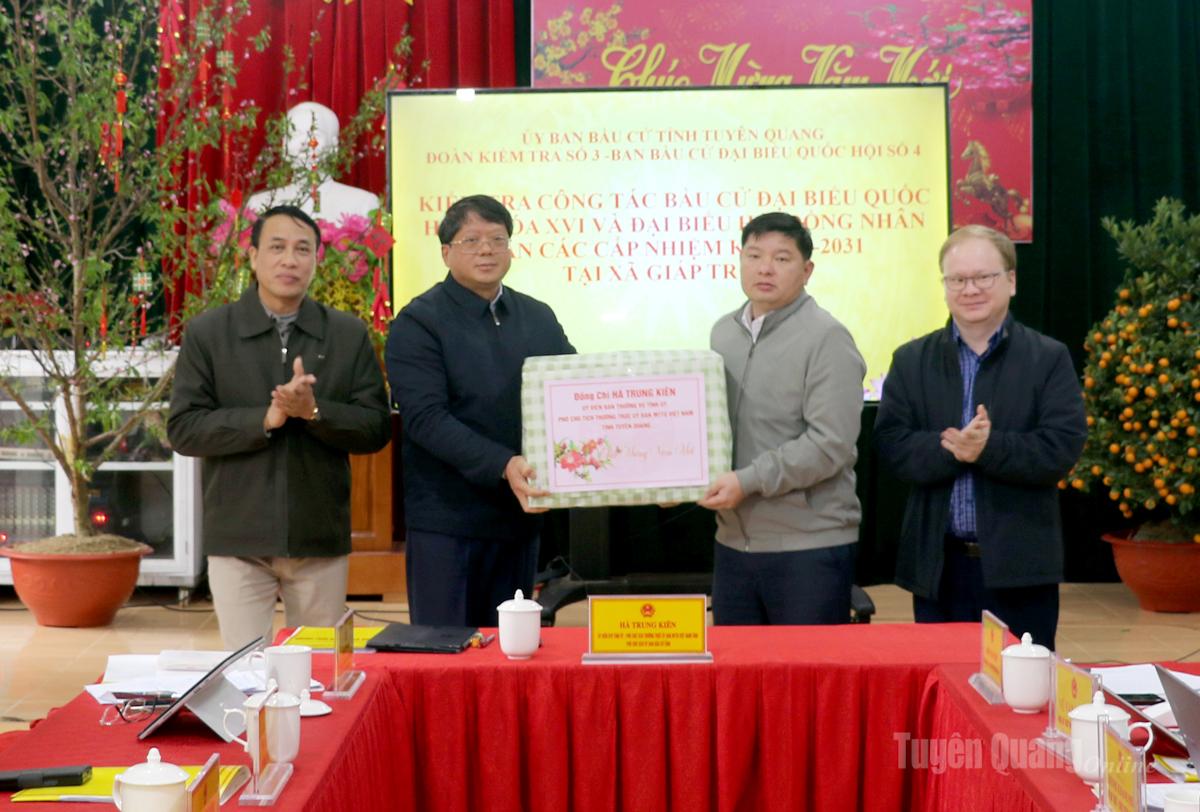 Phó Chủ tịch Thường trực Ủy ban MTTQ tỉnh Hà Trung Kiên tặng quà cho Đảng ủy, HĐND, UBND, Ủy ban MTTQ Việt Nam xã Giáp Trung.