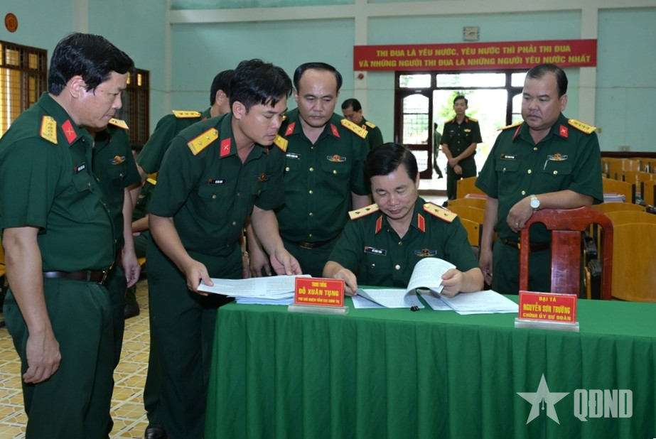 Trung tướng Đỗ Xuân Tụng, Phó chủ nhiệm Tổng cục Chính trị kiểm tra sổ sách hoạt động công tác Đảng, công tác chính trị tại Trung đoàn 9, Sư đoàn 8, Quân khu 9.