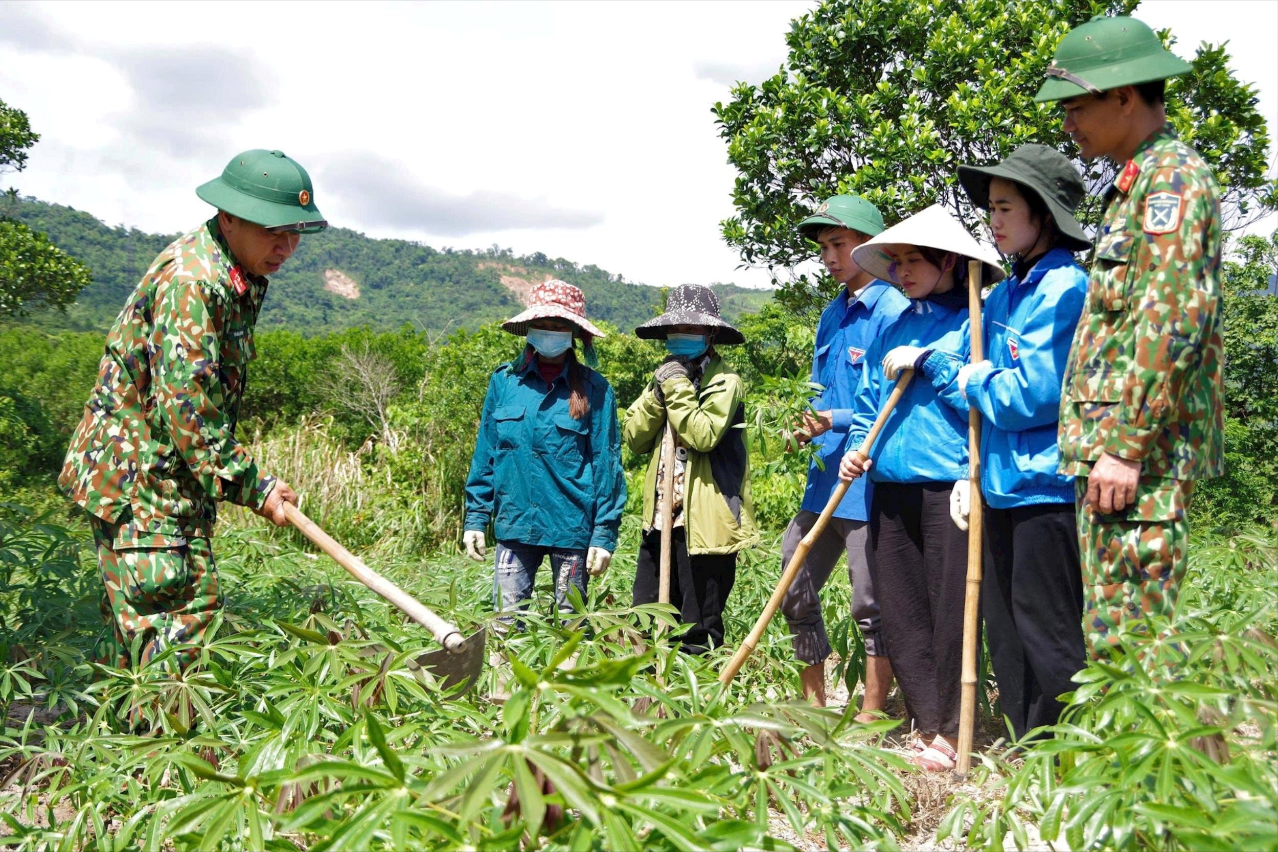 Các chiến sĩ Đoàn KT_QP 337 hướng dẫn bà con đồng bào dân tộc Vân Kiều - Pa Cô ở miền Tây biên giới tỉnh Quảng Trị chăm sóc cho cây sắn. Một trong những mô hình kinh tế có hiệu quả hiện nay đã giúp người dân nơi đây thoát nghèo vươn lên làm giàu.