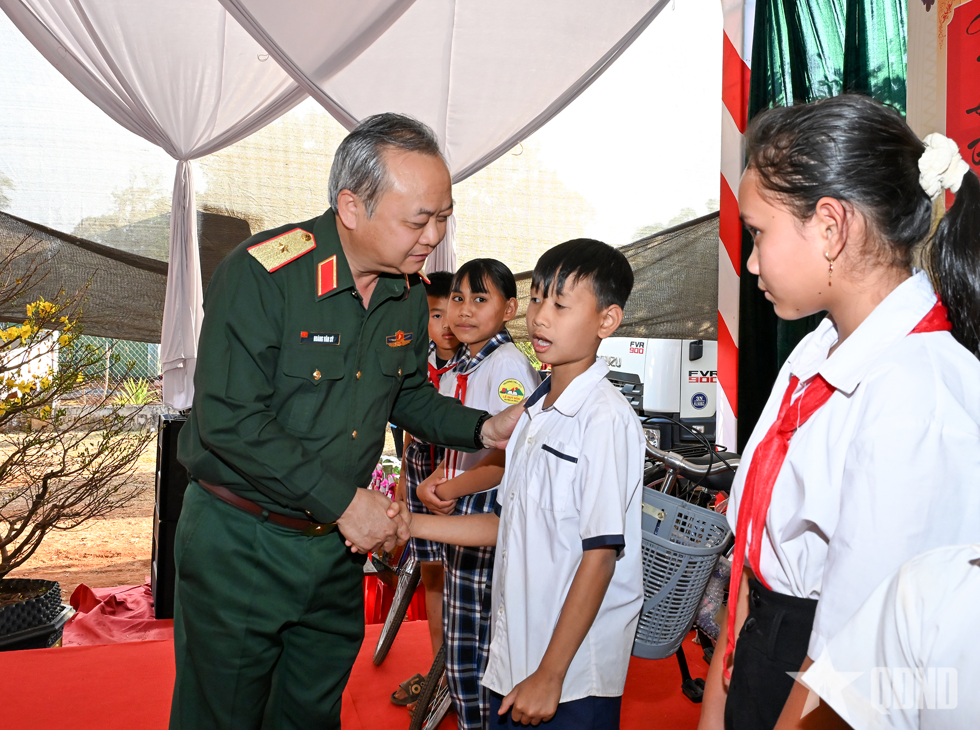 Thiếu tướng Hoàng Văn Sỹ trao xe đạp tặng các em học sinh.