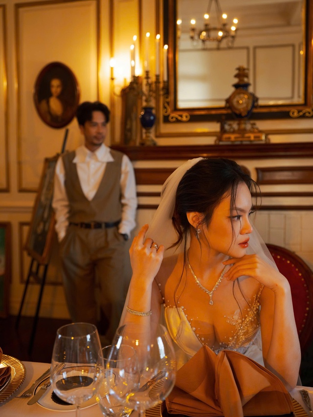 Với các thiết kế của NTK Phạm Đăng Anh Thư, bộ ảnh được thực hiện tại Đà Lạt, mang tinh thần cổ điển, trầm lắng và đầy chất điện ảnh. Không gian nội thất châu Âu, cầu thang gỗ, ánh đèn vàng ấm cùng những khung cửa lớn tạo cảm giác như một thước phim tình yêu mang hơi thở vintage. Cô dâu Sunny Đan Ngọc xuất hiện trong mẫu váy ôm dáng, đính kết tinh xảo, xử lý chất liệu xuyên thấu khéo léo, vừa tôn đường nét cơ thể vừa giữ được sự thanh lịch. Các chi tiết nơ lớn, lớp voan mỏng và trang sức tối giản giúp tổng thể trở nên sang trọng.