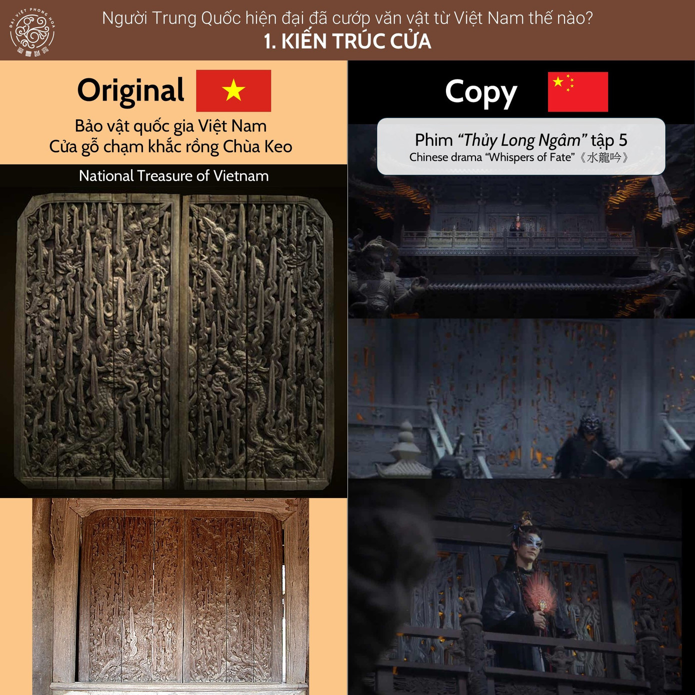 Ngày 2/11, dân mạng đồng loạt chia sẻ những hình ảnh chụp lại từ đoạn cắt ở Thập Tam Lâu trong tập 5 của Thủy Long Ngâm có bối cảnh sử dụng hoa văn được cho là giống với hai cánh cửa chạm rồng - là bộ cánh cửa chính của tam quan nội chùa Keo.