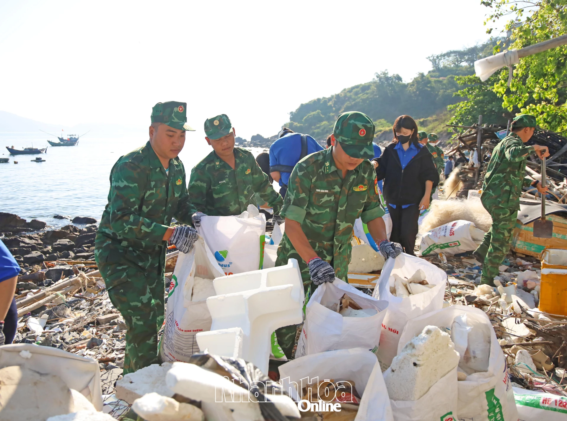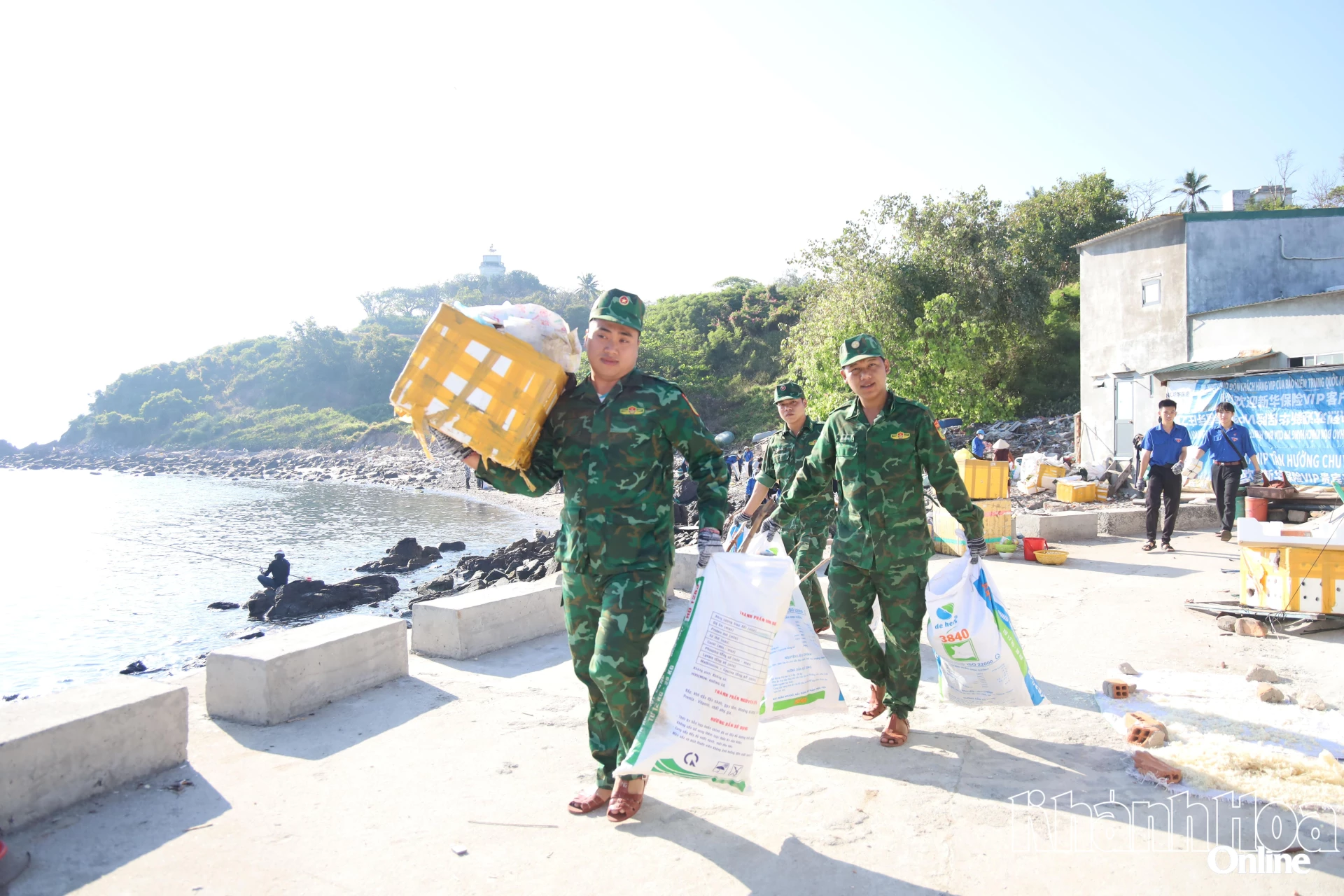 Đoàn viên Chi đoàn Đồn Biên phòng Cửa khẩu Cảng Nha Trang tham gia dọn vệ sinh.