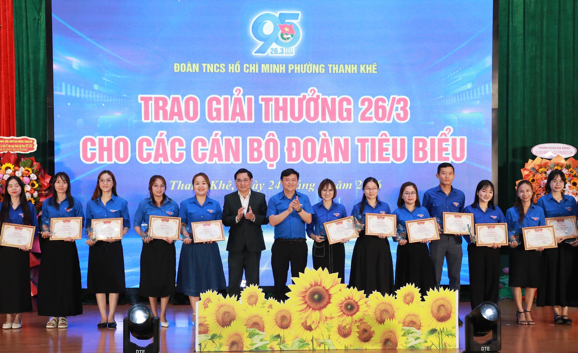 Bí thư Thành Đoàn Lê Công Hùng (thứ 7, bên trái qua) và Bí thư Đảng ủy phường Thanh Khê Nguyễn Thành Tiến (thứ 6, bên trái qua) trao giấy khen và biểu trưng cho những cán bộ Đoàn xuất sắc. Ảnh: ĐẮC MẠNH