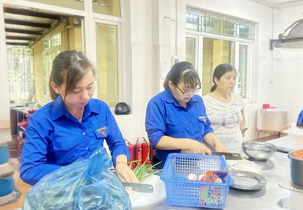 Đoàn viên thanh niên phường Thục Phán nấu cơm hỗ trợ người dân bị ảnh hưởng do bão số 11 tại nhà văn hóa tổ Hưng Đạo.