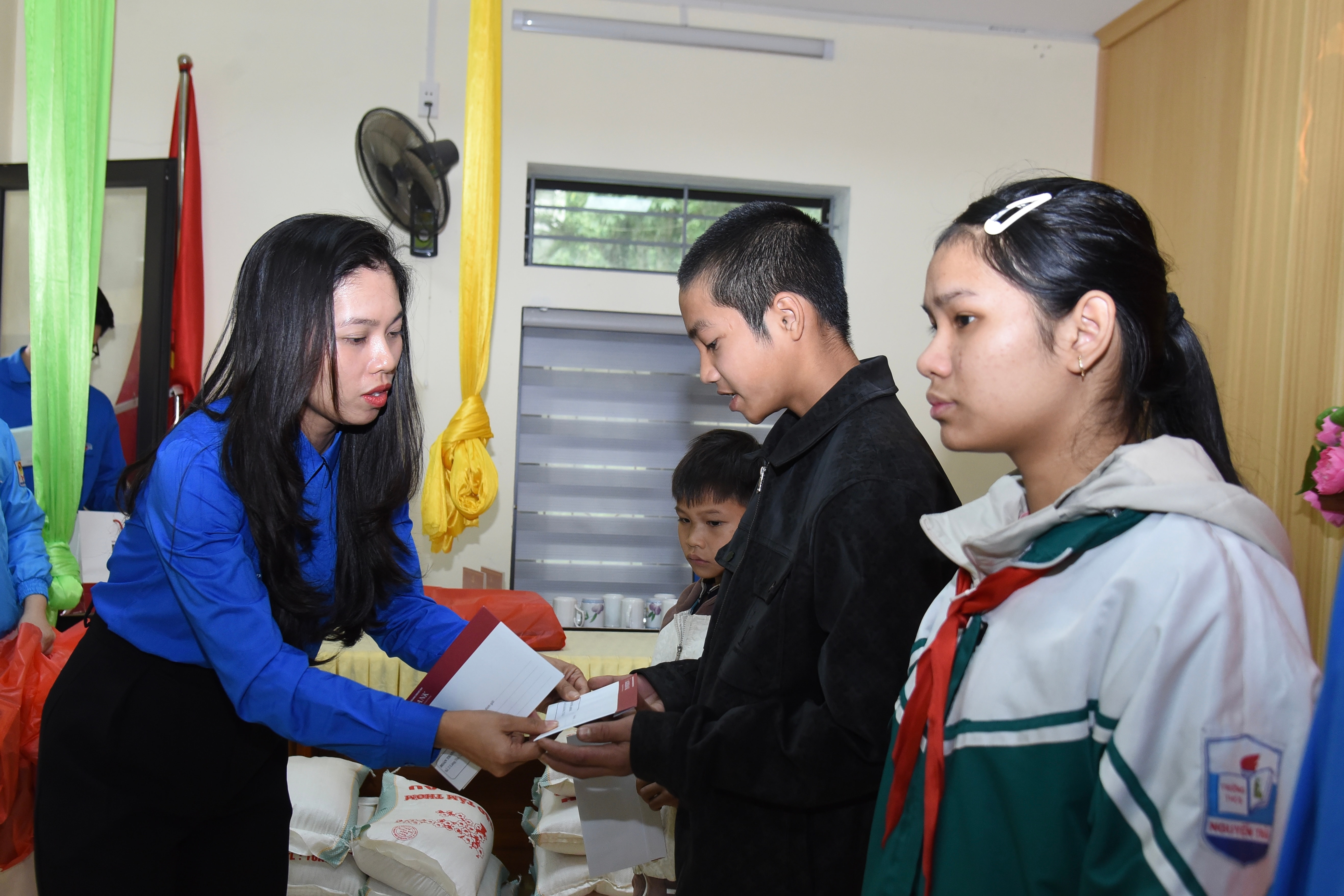 Ủy viên Ban Chấp hành Đoàn Thanh niên Ngân hàng Nông nghiệp và Phát triển nông thôn Việt Nam Hoàng Thị Thúy trao tặng quà Tết cho gia đình chính sách, người có công với cách mạng và học sinh, thiếu nhi có hoàn cảnh đặc biệt khó khăn